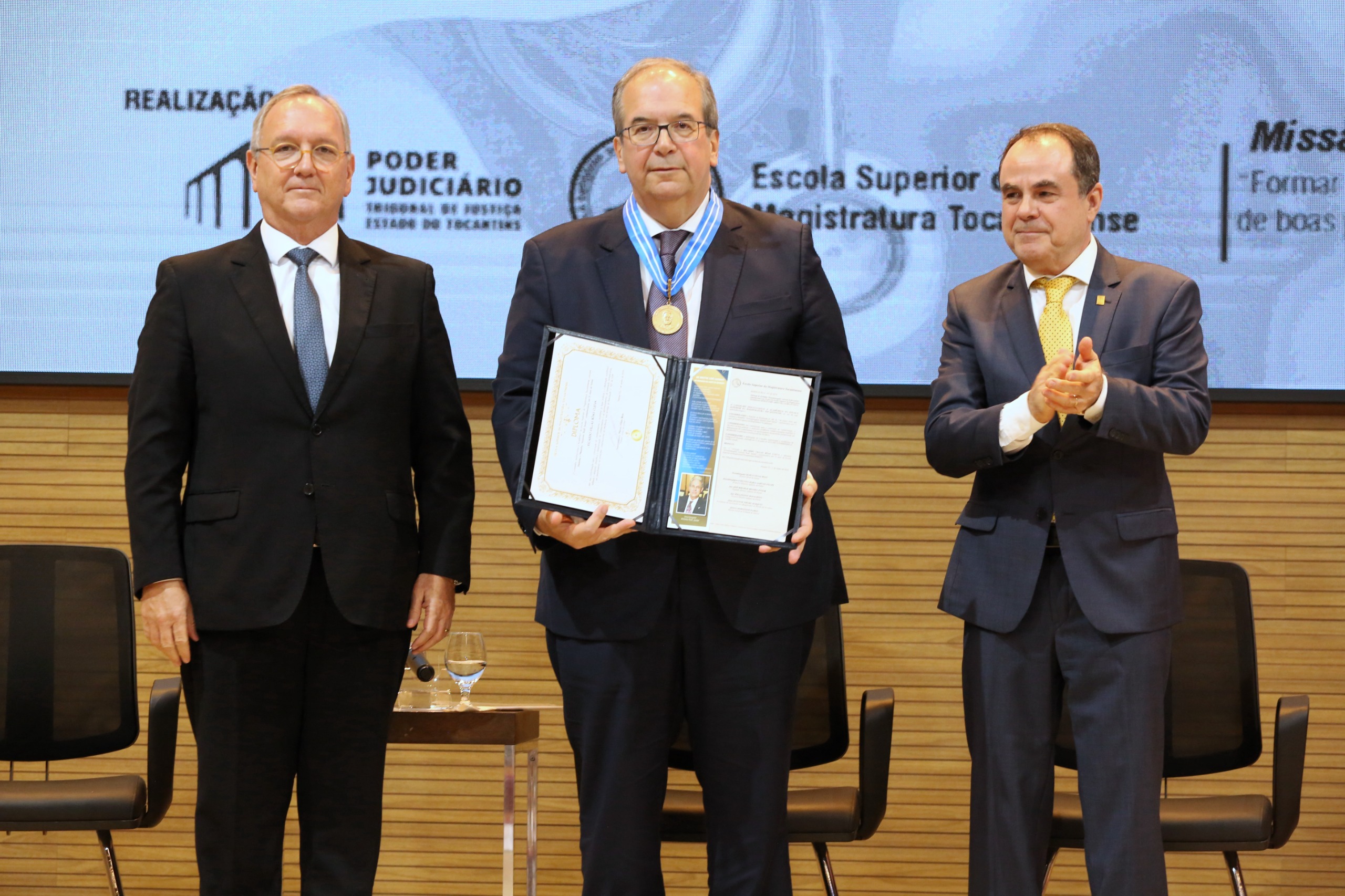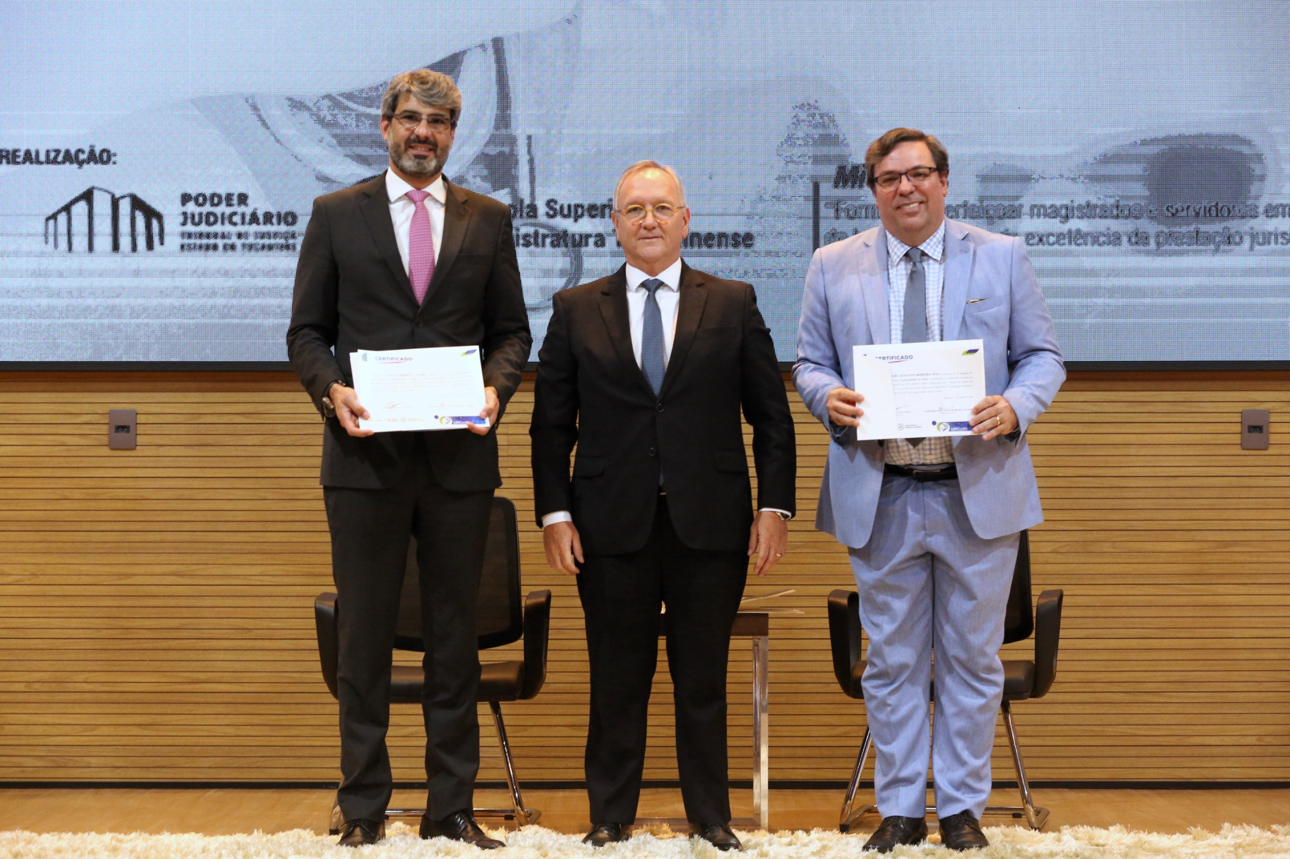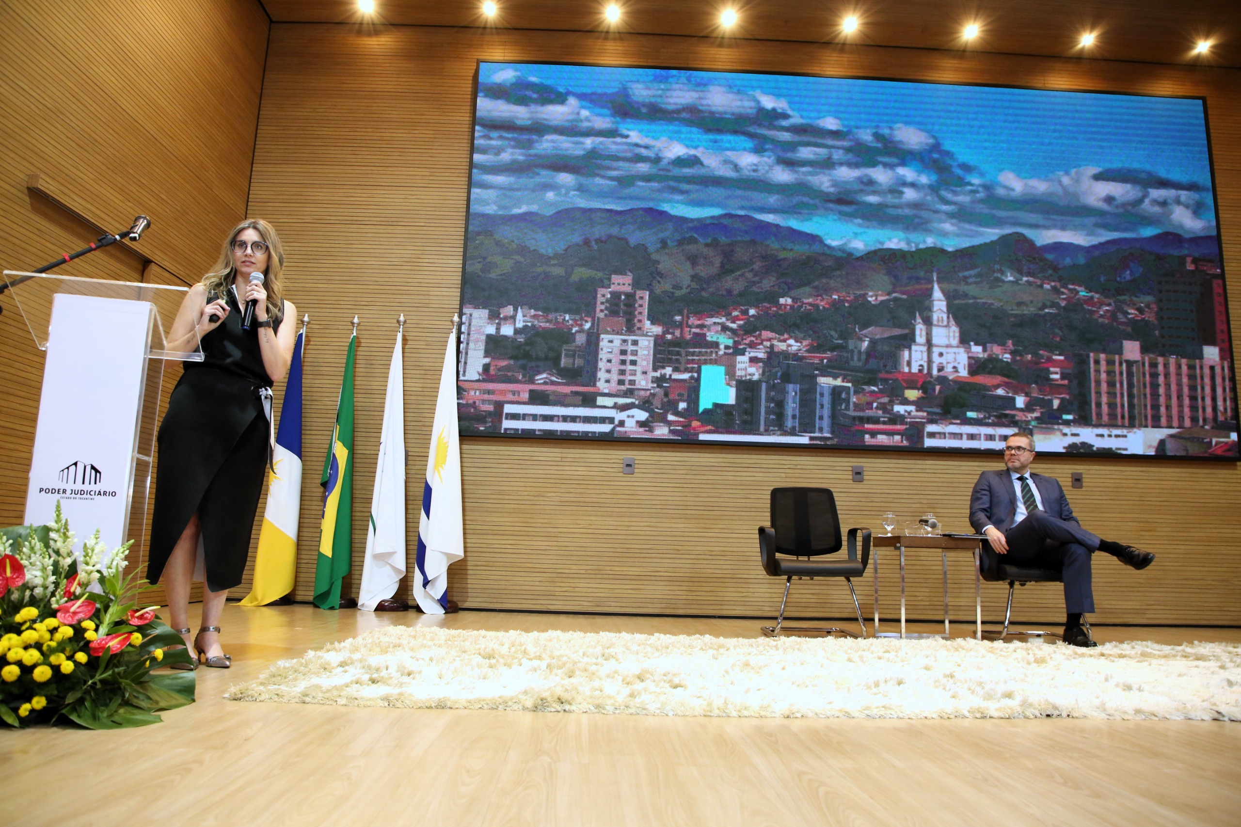 Hodirley Canguçu Mulher de vestido roxo sentada à esq, ao seu lado uma mulher de vestido preto, na sequência, quatro homens de terno escuro sentados no palco do TJTO. Ao fundo, painel de LED