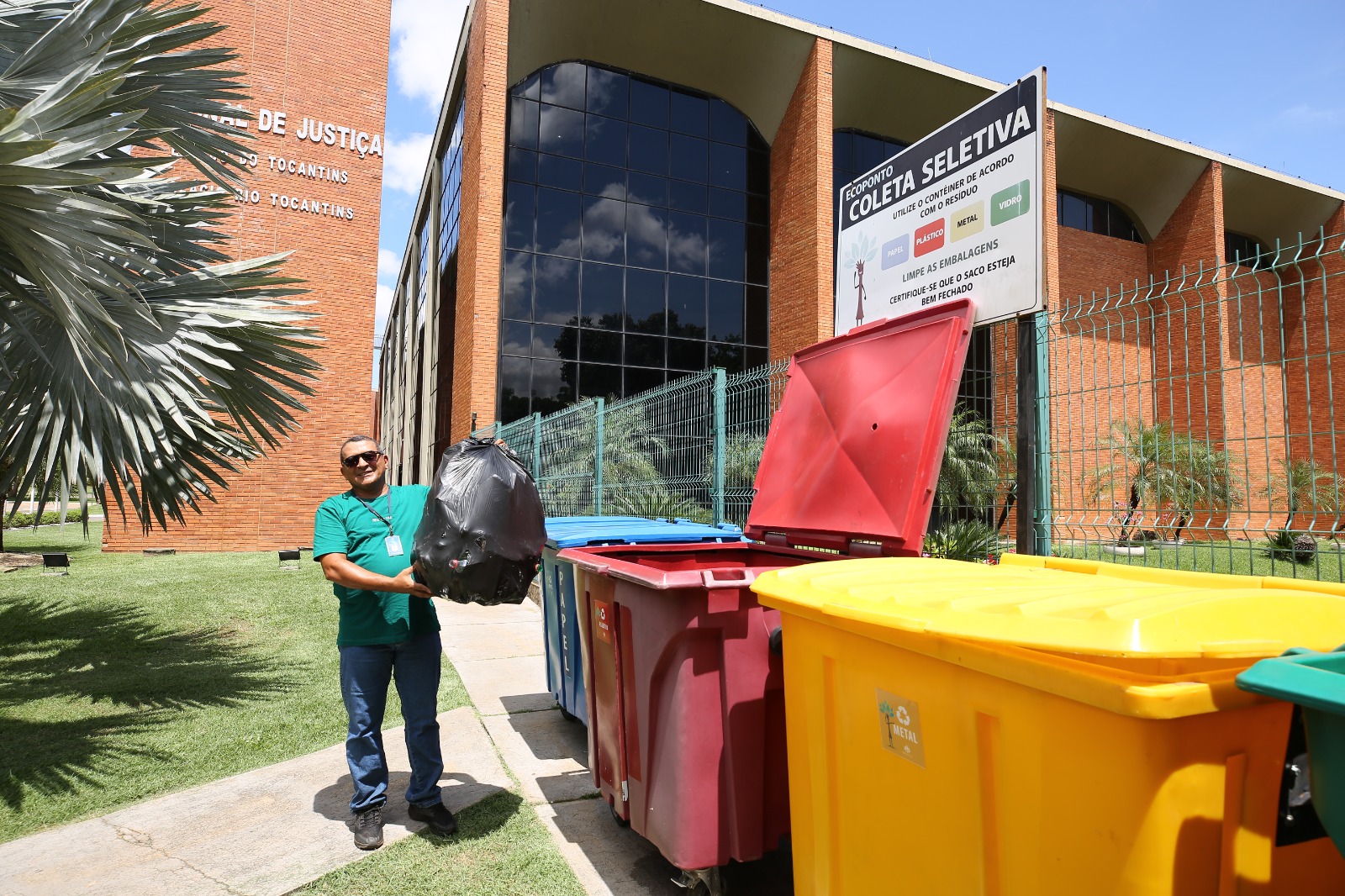 Elias Oliveira Imagem mostra uma servidora colocando um saco plástico em um recipiente de reciclagem. A mulher está de frente para a câmera. O recipiente de reciclagem é verde. Atrás dela aparece o prédio do TJTO, de tijolos com várias janelas e um portão. Ao redor parece o jardim, com palmeiras e grama.