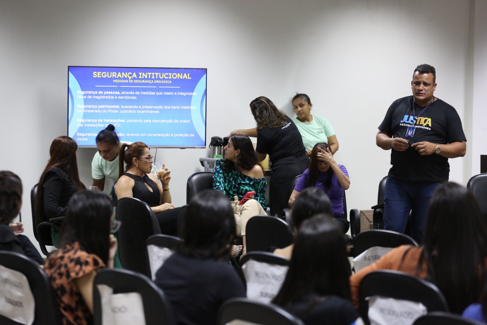 A programação também ofereceu, longe da formalidade característica dos encontros do Poder Judiciário, conversas sobre temas ligados à missão, visão e valores da Justiça do Tocantins, além da política de inovação. A diretora de comunicação social, Kézia Reis, falou sobre a utilização das ferramentas Google, adquiridas pelo TJTO e os canais de informação, portal e redes sociais. Além de tirar dúvidas sobre as atualizações do Sistema Eproc, o diretor judiciário, Wallson Brito apresentou as metodologias de identificação e resolução de problemas do Inovassol - Centro de Inovação do TJTO. Já o assessor militar adjunto, tenente coronel Ricardo Apolinário, apresentou as diretrizes de Segurança Institucional sobre possíveis ameaças contra dados, informações, materiais, áreas, instalações e pessoas no âmbito do Poder Judiciário.