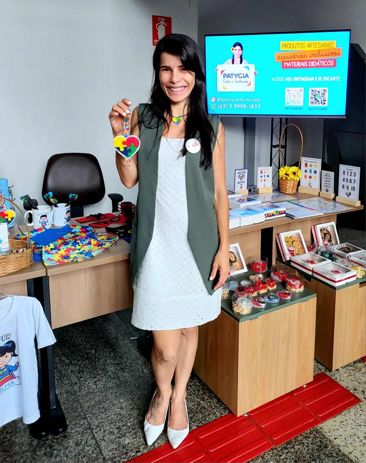 Em meio ao evento da Semana de Acessibilidade e Inclusão que visa proporcionar uma discussão e sensibilização acerca das questões relacionadas às pessoas com deficiência, o público pôde adquirir apostilas, crachás, colares, laços e roupas, todos com temas que remetem ao autismo e outras deficiências visíveis e ocultas. Além disso, foram distribuídos cartões de apresentação para divulgar os produtos que a mãe atípica comercializa.