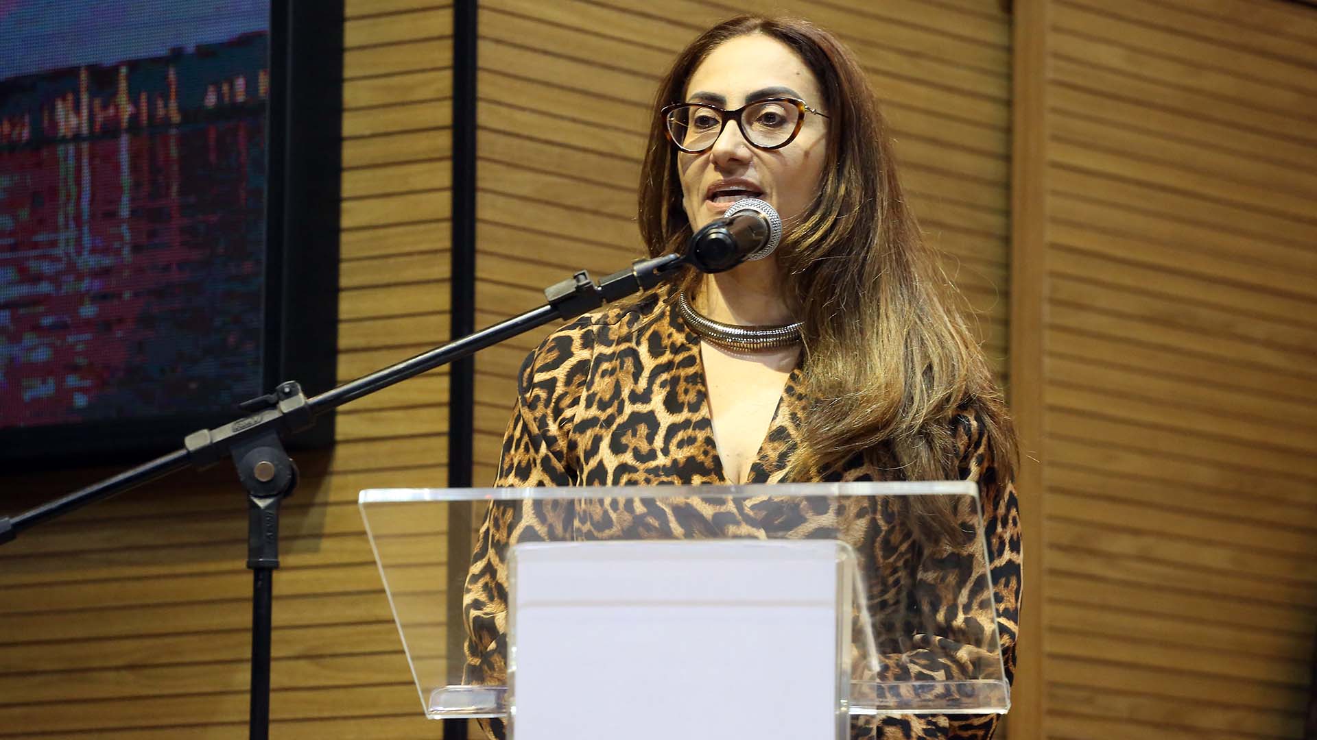 Elias Oliveira Mulher branca fala num púlpito  com imagens em um telão de fundo.