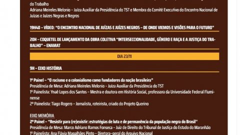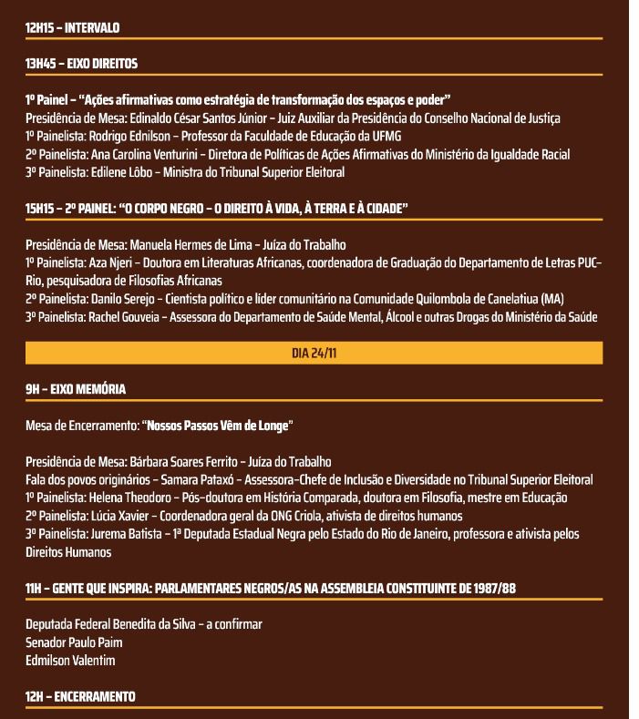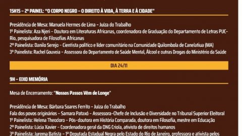 Na ocasião, juristas e especialistas em História, Sociologia, Literatura e Educação discutem temas como racismo e colonialismo, ações afirmativas, o racismo na contemporaneidade, o direito de pessoas negras à vida, à terra e à cidade e a trajetória de luta dessa população, inclusive sua participação na Assembleia Nacional Constituinte.