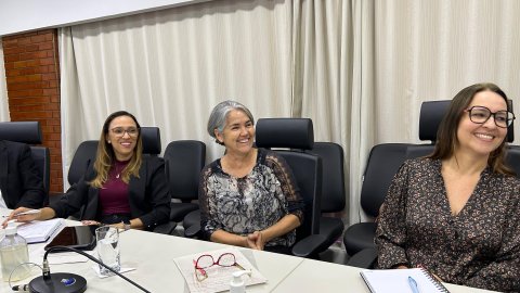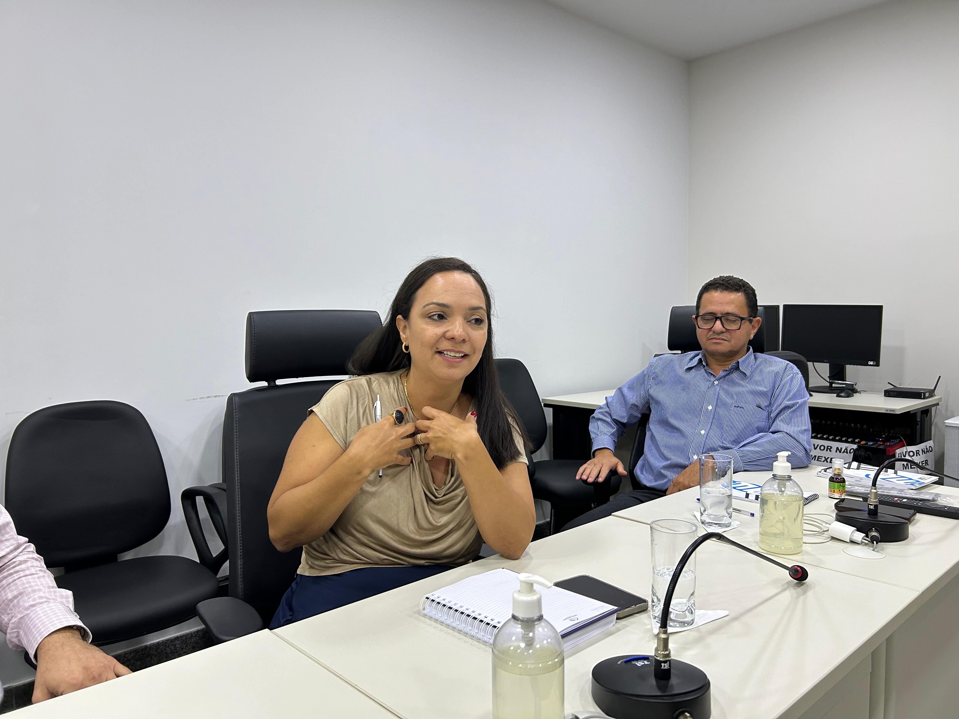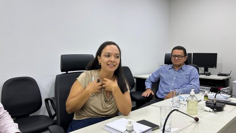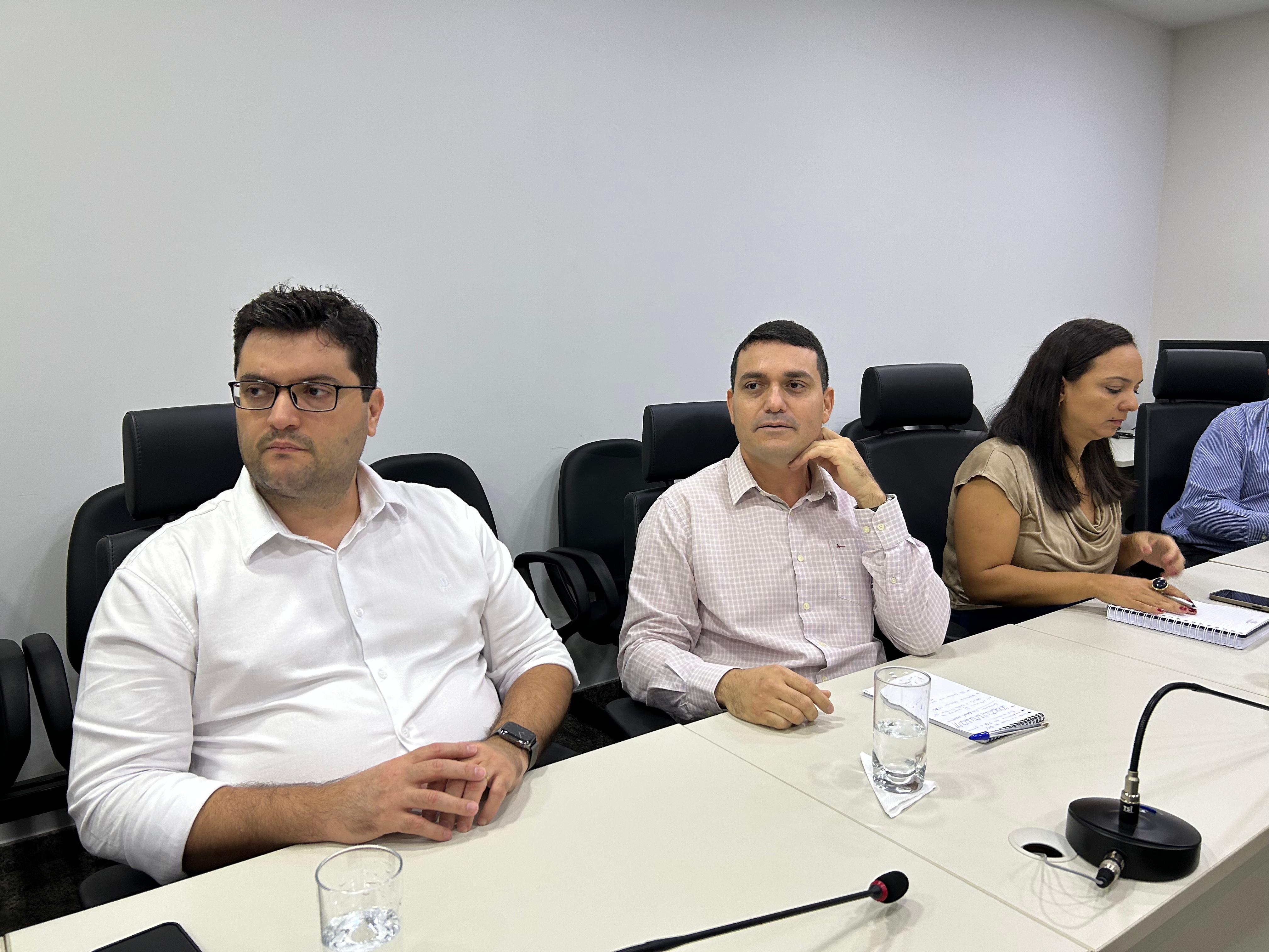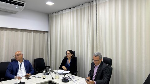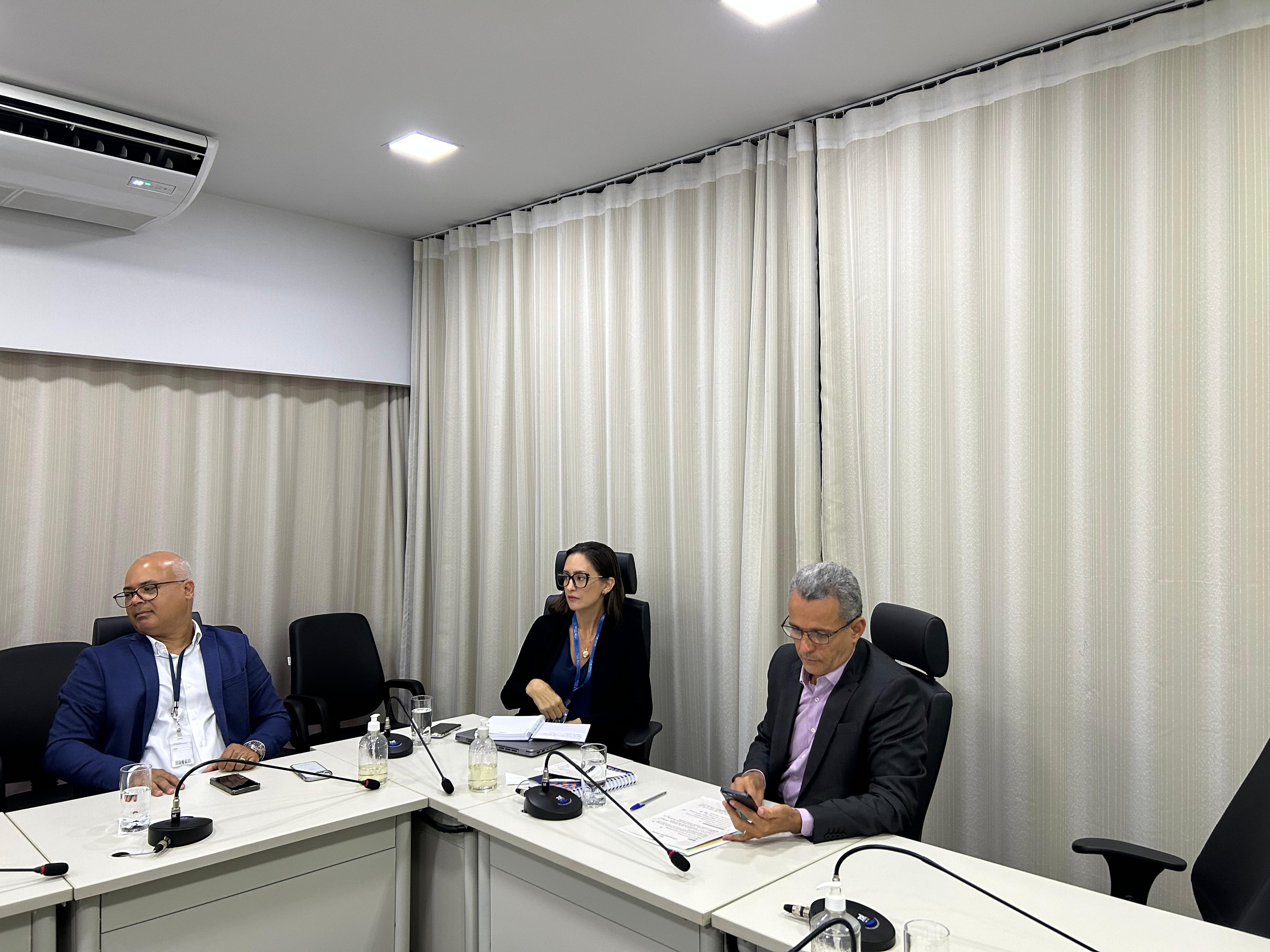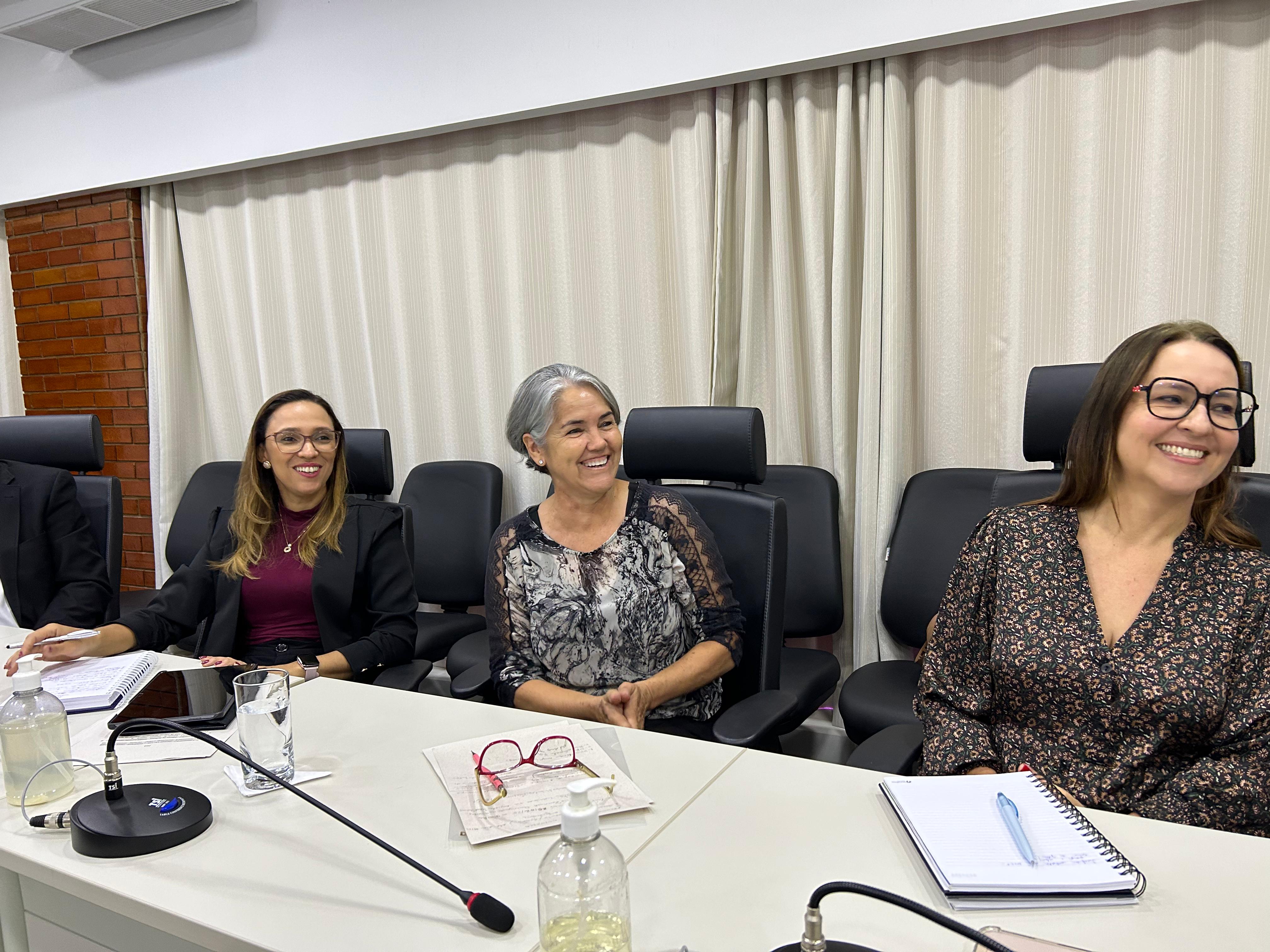 Divulgação Cecom/TJTO Homens e mulheres sentados em mesa branca em formato U, em sala de paredes brancas e persiana bege