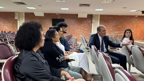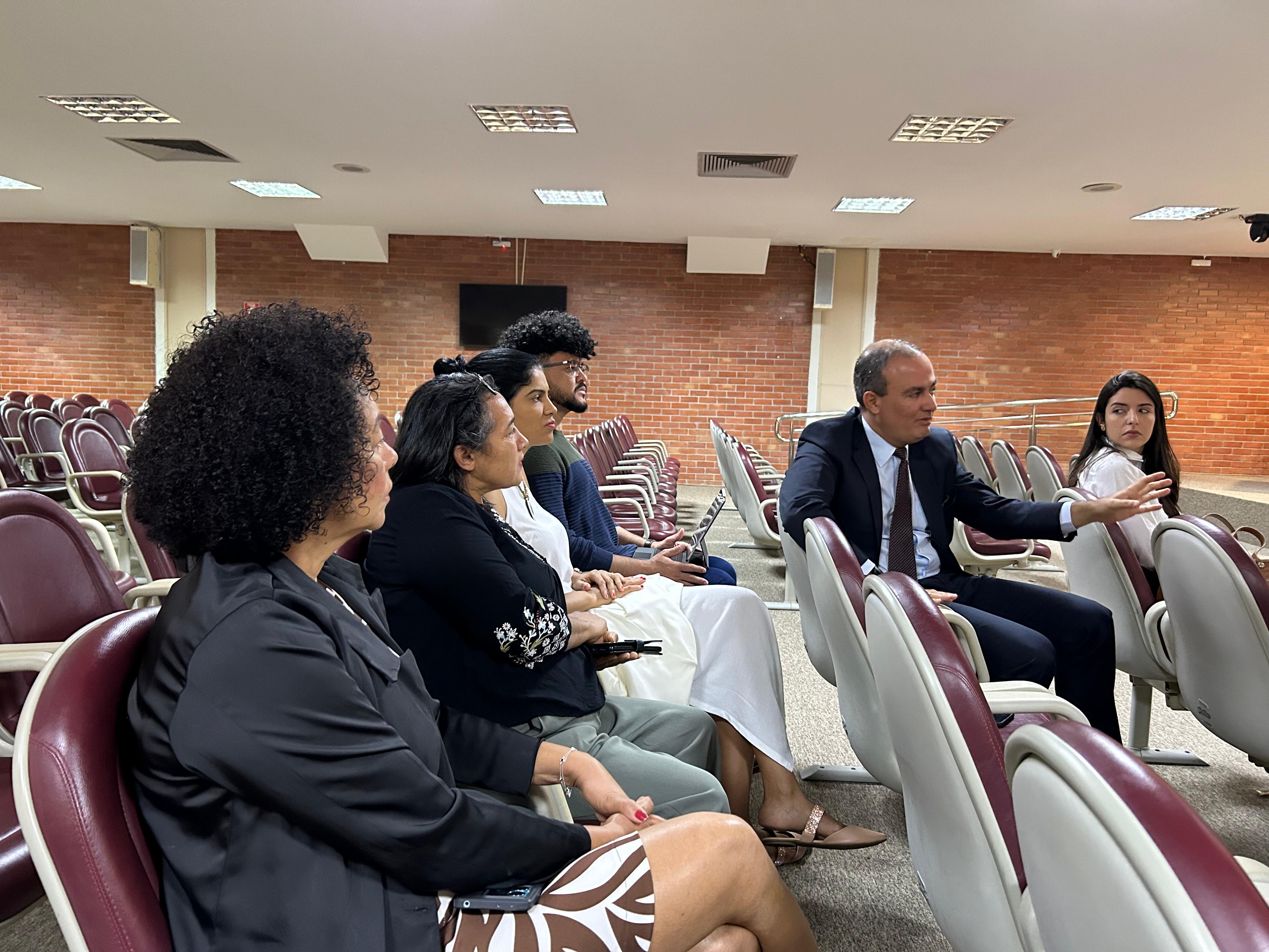 Helamara Lopes/Cecom TJTO Homem pardo, magro, cabelos e barba rentes, veste terno azul escuro e fala pra público de homens e mulheres sentados em cadeiras de cor vinho de auditório com carpete bege no piso e paredes claras, com persianas beges