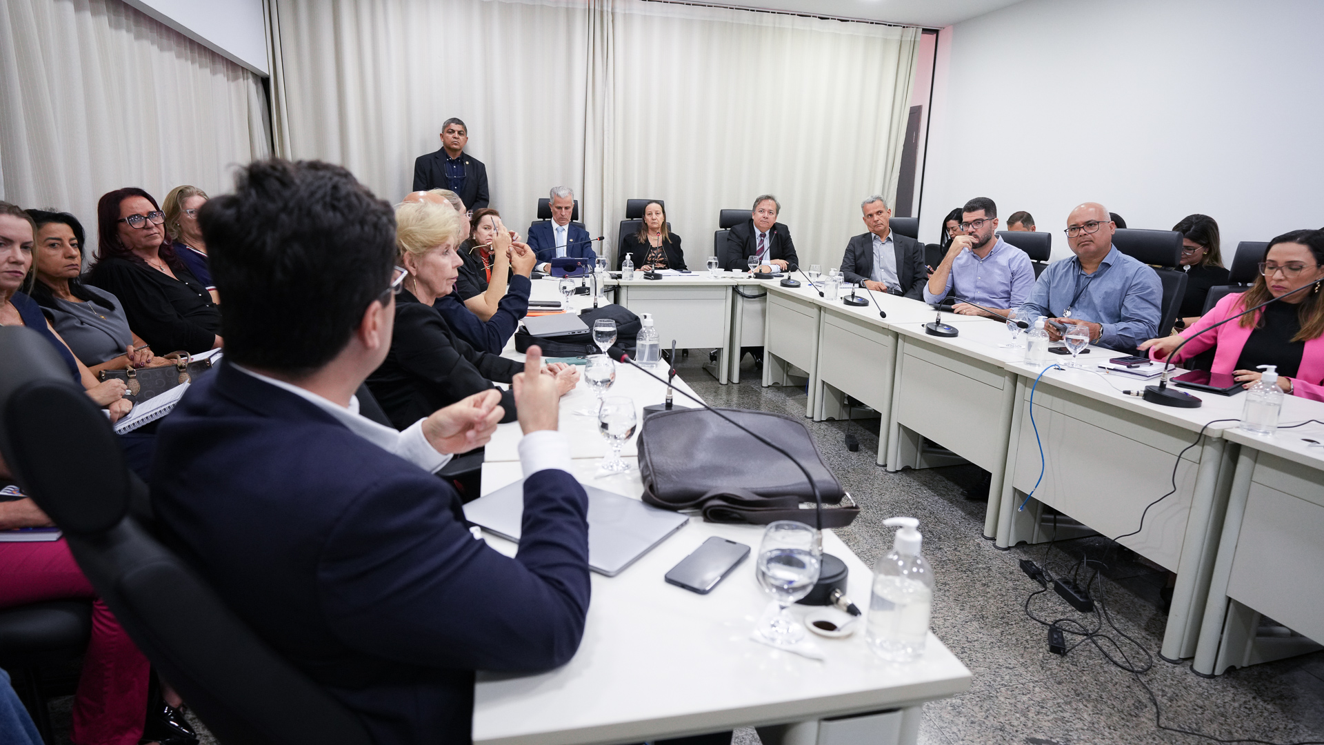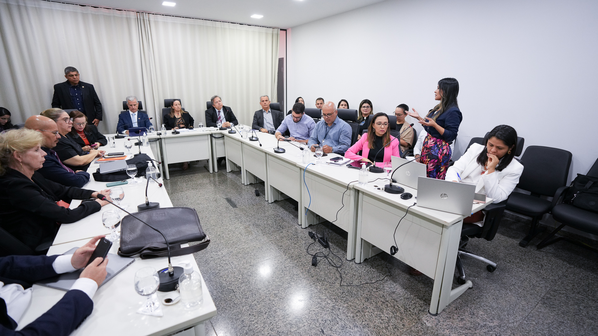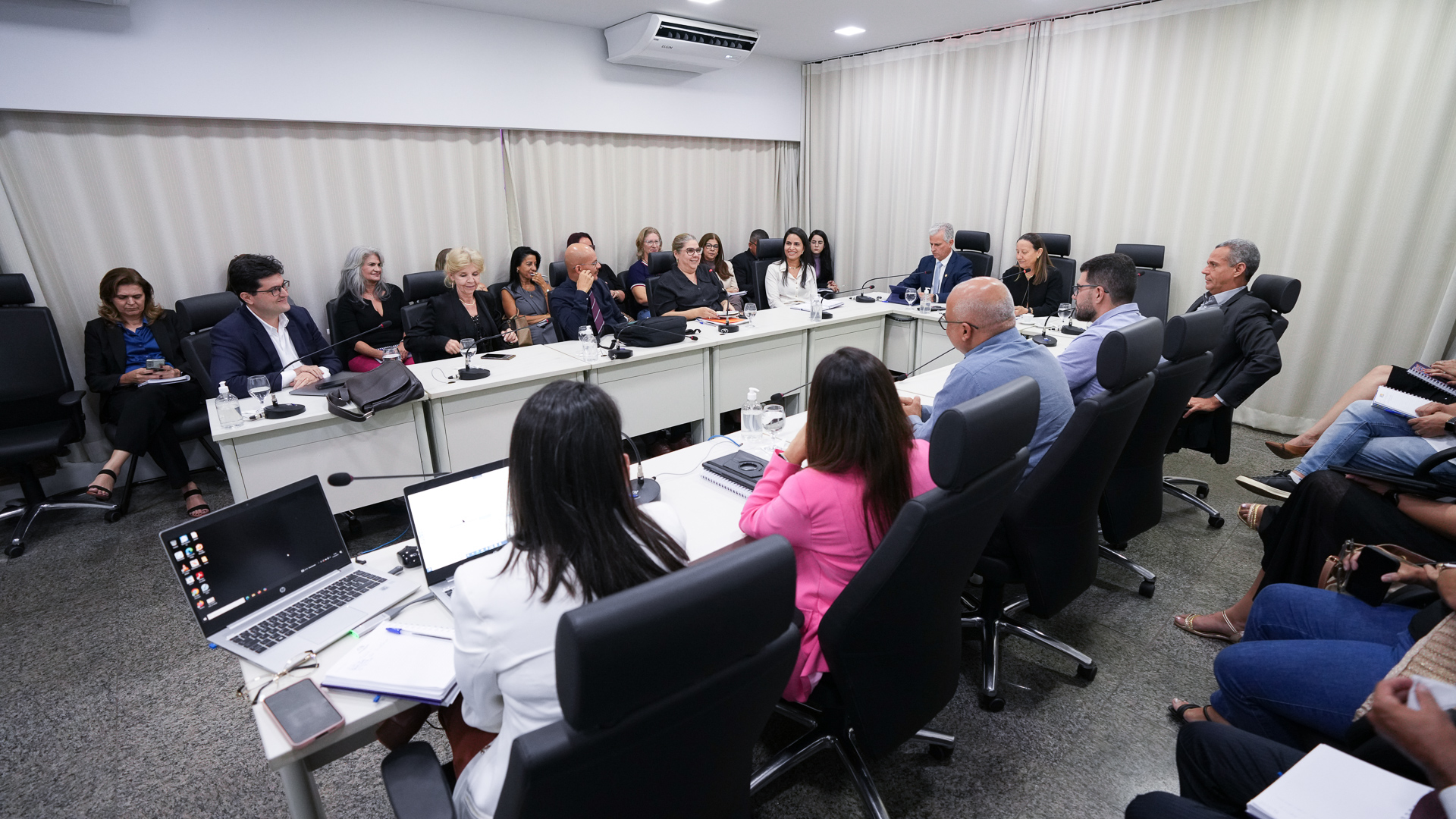 Lucas Nascimento Homens e mulheres sentados em mesa branca em formato U, em sala de paredes brancas e persiana bege