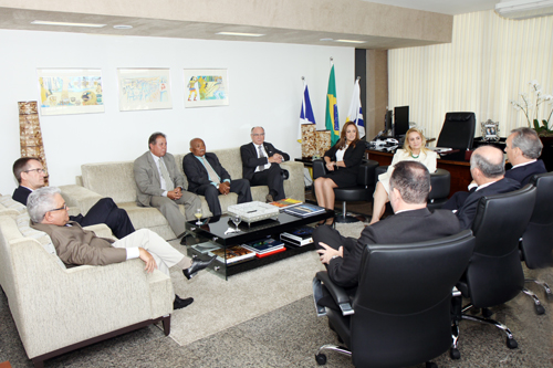 O Embaixador da Alemanha no Brasil, Wilfried Grolig, foi recebido nesta terça-feira (19/2), pela Presidente do Tribunal de Justiça, Desembargadora Ângela Prudente, ao lado dos Desembargadores Daniel Negry, Eurípedes Lamounier e Ronaldo Eurípedes; dos Juízes Pedro Nelson de Miranda Coutinho, Helvécio de Brito Maria, Agenor Alexandre e Célia Regina Régis, além dos diretores do TJTO. O Embaixador estava acompanhado do Conselheiro para Assuntos Científicos e Intercâmbio Acadêmico, Dirk Schüller, e da Secretária Estadual de Ciência e Tecnologia e Presidente da Fundação de Amparo à Pesquisa, Andrea Stival.