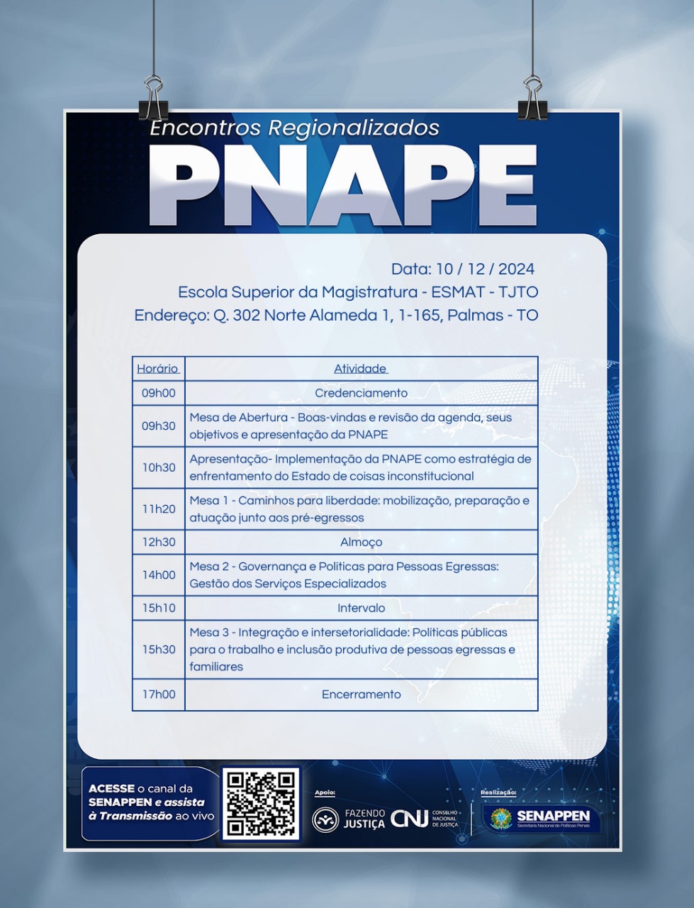 O Encontro Regional da Política Nacional de Atenção à Pessoa Egressa do Sistema Prisional (PNAPE) será realizado no dia 10 de dezembro, na Escola Superior de Magistratura (Esmat), em Palmas. O evento, organizado pela Secretaria Nacional de Políticas Penais (Senappen), visa discutir e fortalecer ações voltadas para à reintegração de egressos do sistema prisional.