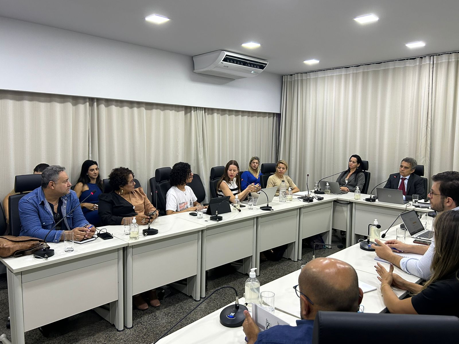 Divulgação Cecom/TJTO Homens e mulheres sentados em torno de uma mesa branca em formato de U durante reunião