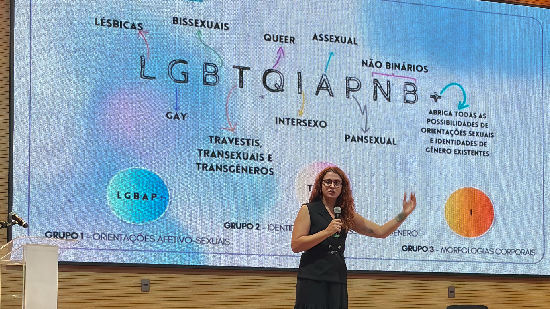 Em sua apresentação, Laura explicou ainda que a sigla LGBTQIAPNb+ é estruturada em três grupos e que, aqueles que buscam entendê-la, consequentemente, poderão otimizar uma escuta qualificada em seus atendimentos. “O primeiro grupo da sigla é voltado à orientação afetivo-sexual. O segundo à identidade e expressão de gênero, buscando o direito de reconhecimento social. E, por fim, o grupo destinado às morfologias corporais, os Is”, explicou.