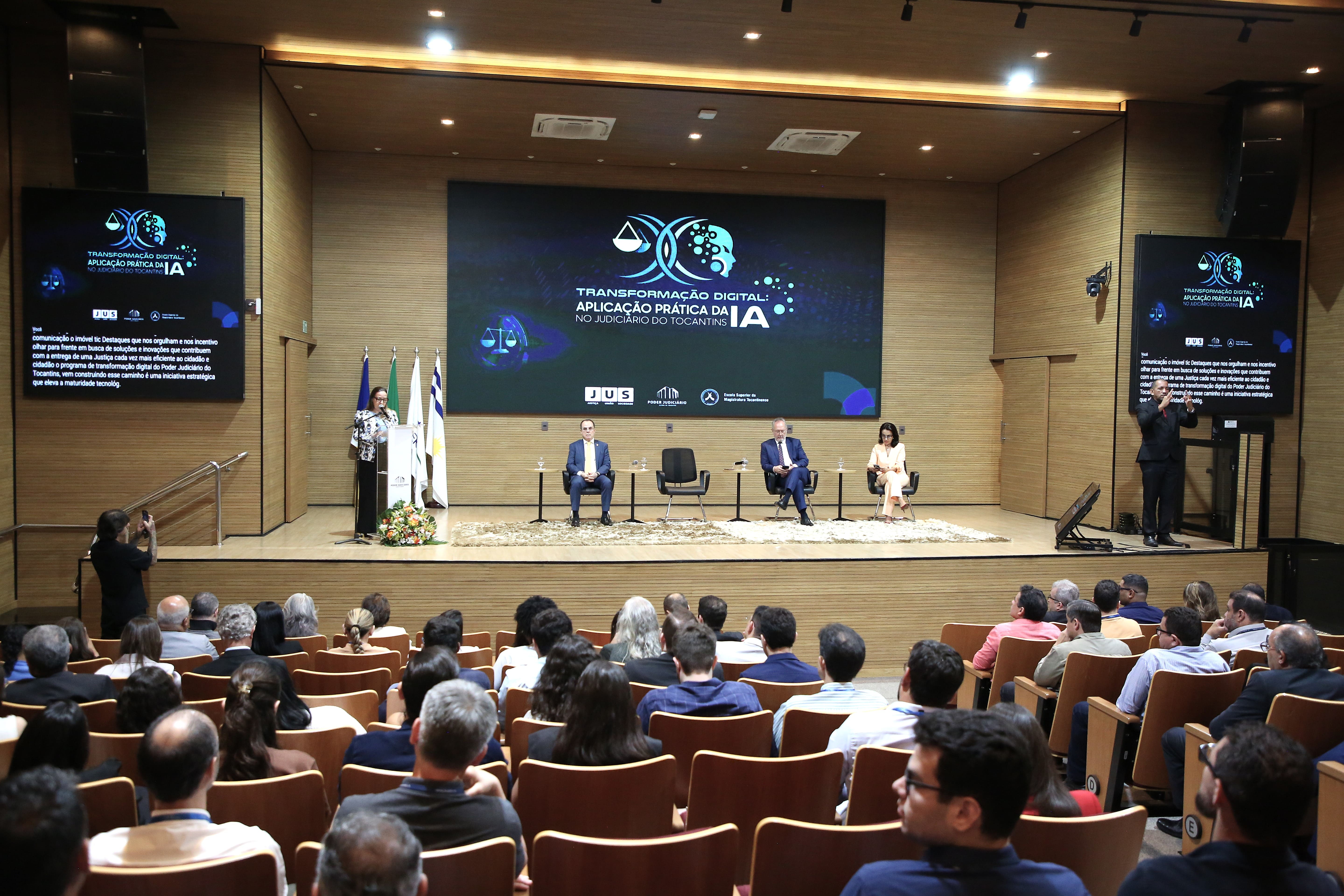 Hodirley Canguçu A imagem mostra o auditório do Tribunal de Justiça do Tocantins lotado durante a abertura do evento “Transformação Digital: Aplicação Prática da IA no Judiciário do Tocantins”, com autoridades no palco e público atento.
