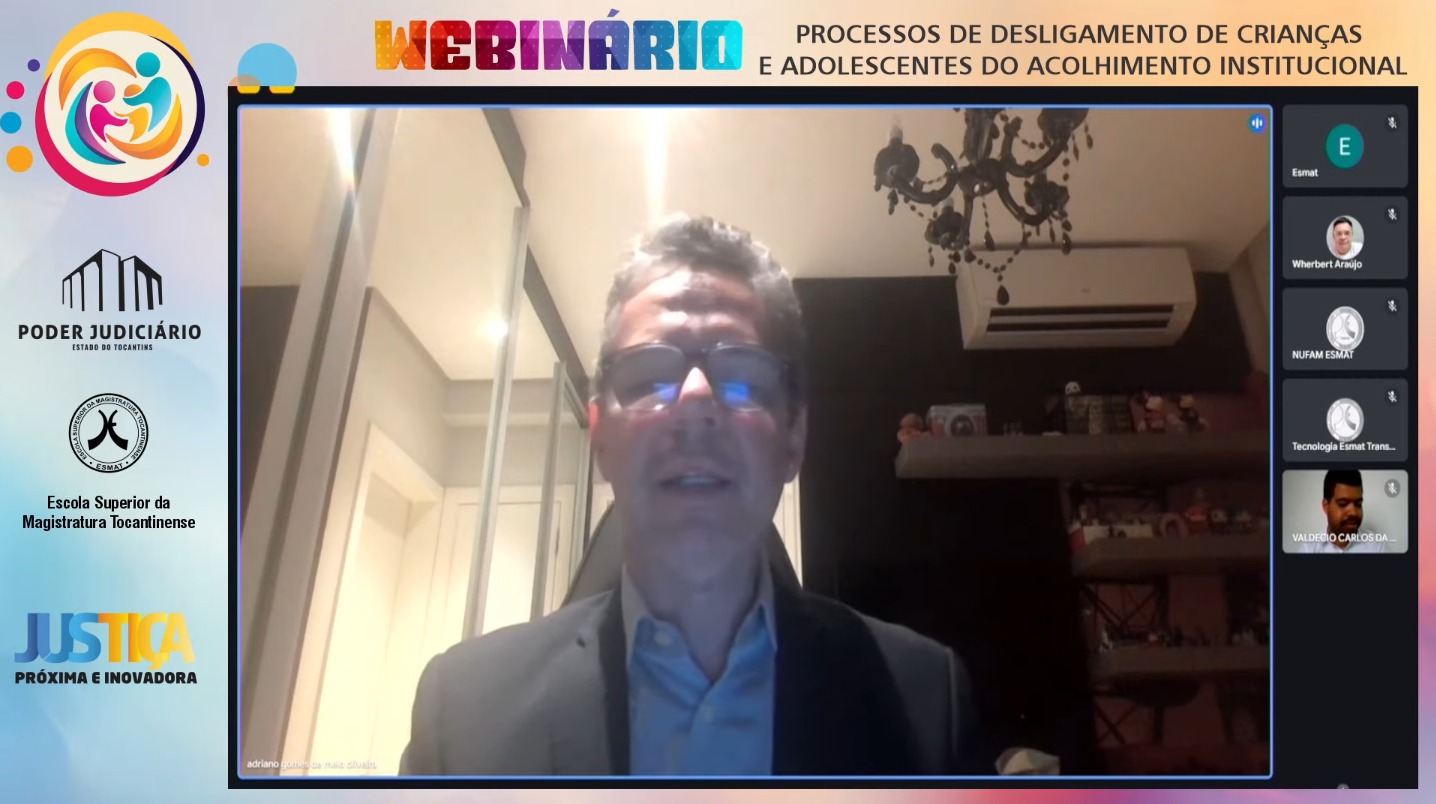 Na manhã desta quarta-feira (13/11), a Escola Superior da Magistratura Tocantinense (Esmat) realizou o Webinário “Processos de Desligamento de Crianças e Adolescentes do Acolhimento Institucional”. A abertura foi conduzida pelo juiz Adriano Gomes de Melo Oliveira, coordenador estadual da Infância e Juventude do Tribunal de Justiça do Estado do Tocantins.