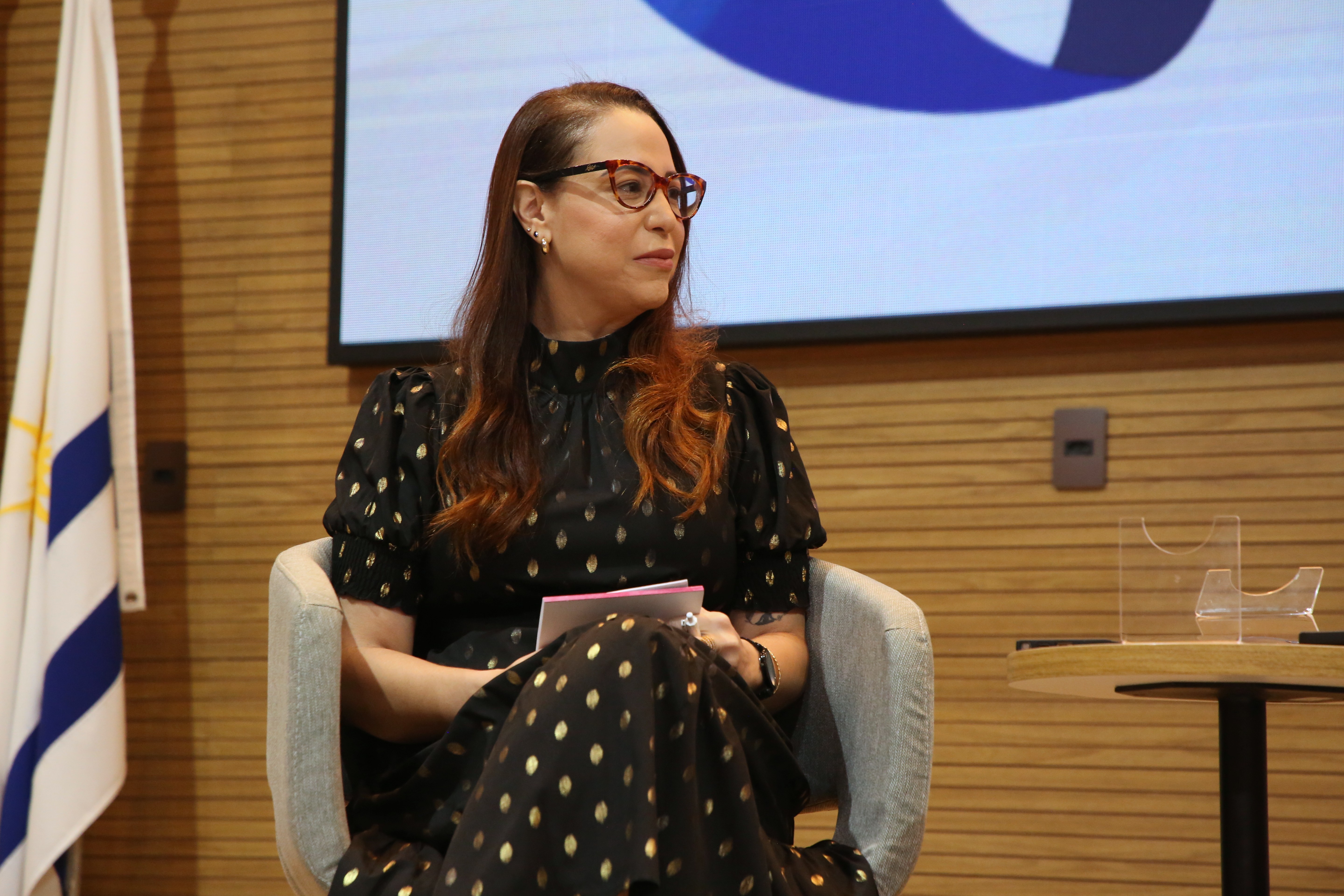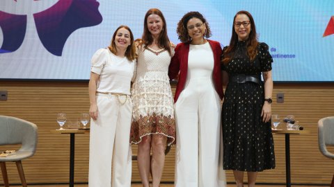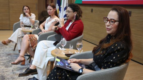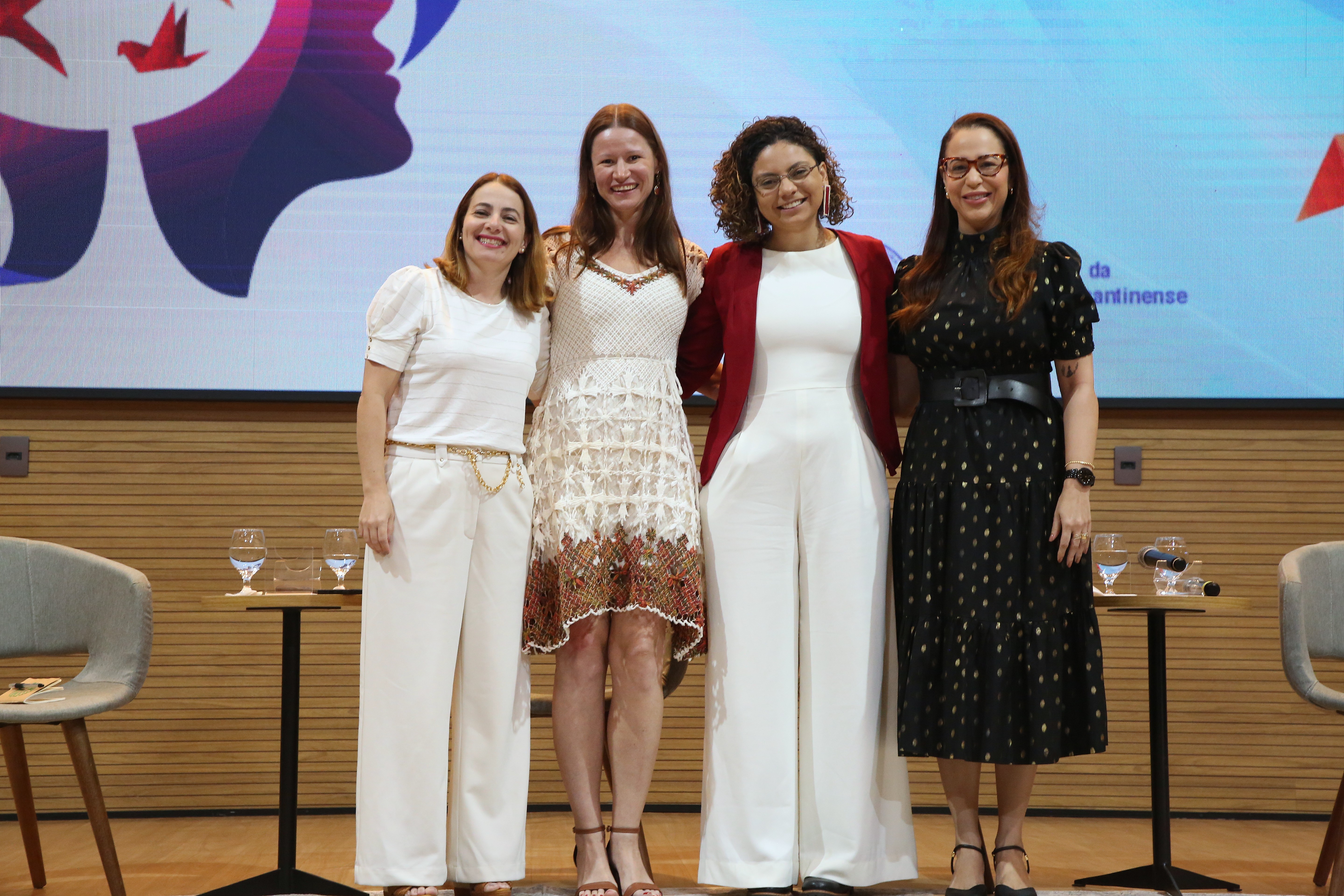 Na imagem, quatro expositoras participam de uma mesa temática durante o evento. Sentadas lado a lado em poltronas cinza, elas dialogam em um ambiente moderno e acolhedor. À esquerda, duas participantes vestem roupas claras, enquanto a terceira, de blazer vermelho e calça branca, fala ao microfone. A quarta expositora, à direita, veste um vestido preto com detalhes dourados e segura um tablet. Ao fundo, o telão exibe os logotipos.