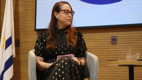 Juliana Biazzi é uma mulher branca, de cabelos claros; ela usavestido claro em tons de laranja e está sentada, no palco do auditório.