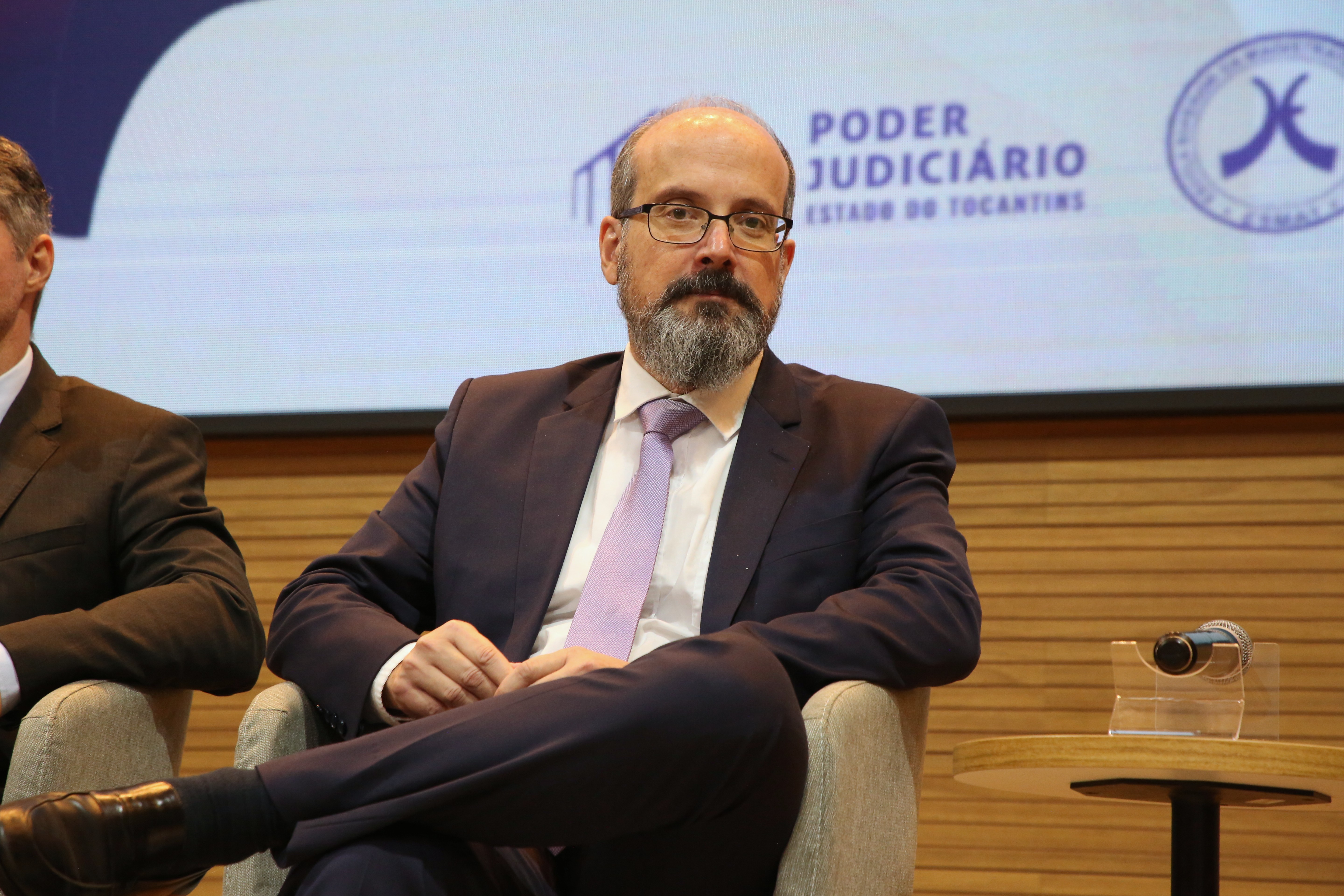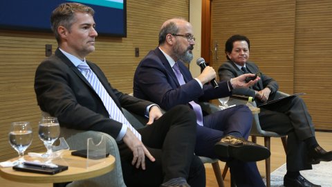 Na foto, três homens participam de uma mesa temática em um auditório. Sentados lado a lado em poltronas cinza, todos vestem terno e gravata, em tom formal e institucional. Ao centro, um dos expositores fala ao microfone, gesticulando enquanto apresenta suas ideias.