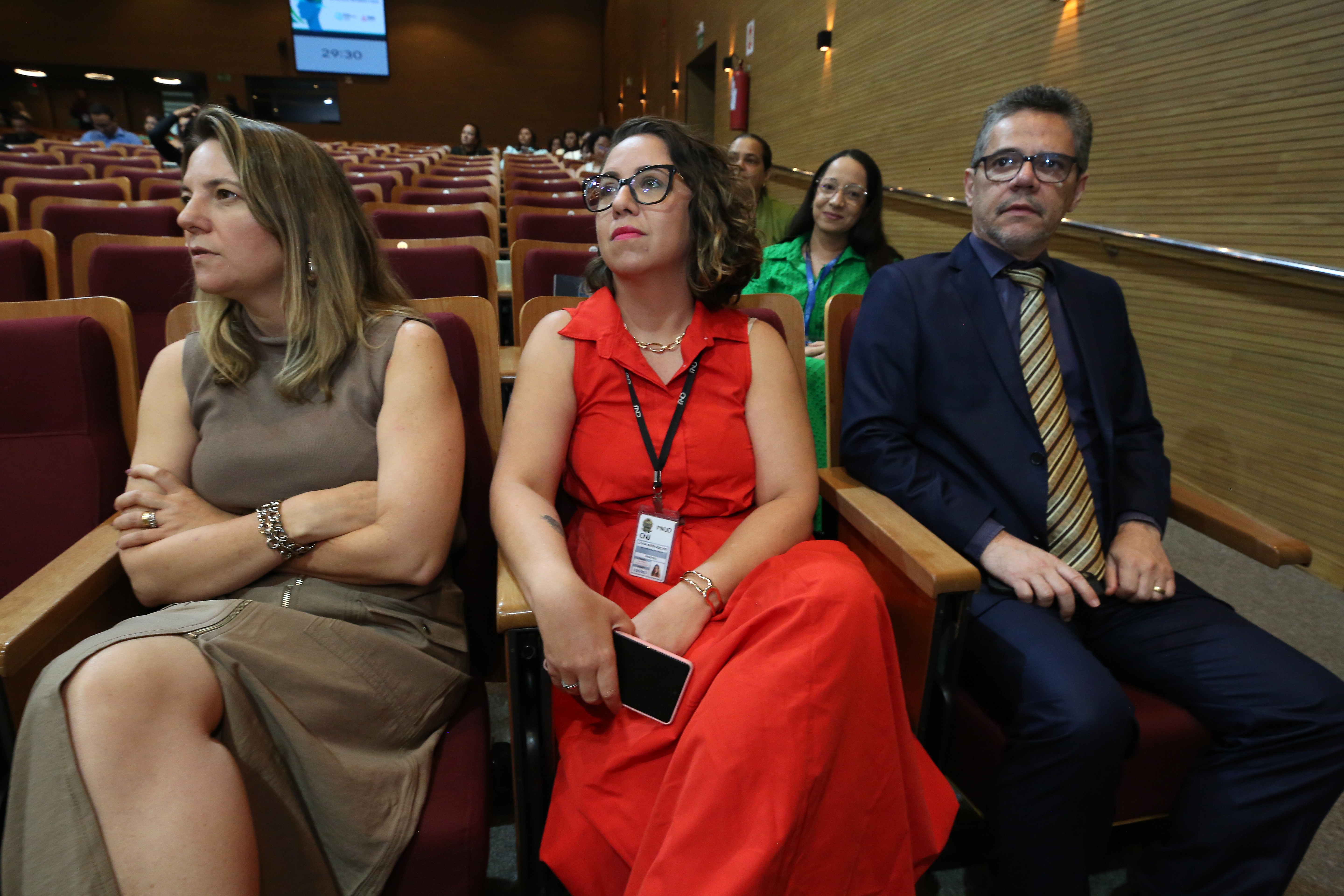 Fotos: Hodirley Canguçu/Esmat Na foto, quatro expositoras participam de uma mesa temática sobre “Saúde Mental e o PIA”, realizada em um auditório moderno. Sentadas em poltronas cinza no palco, elas dialogam diante de uma plateia atenta. Ao fundo, um grande telão exibe o slide com o título da apresentação e o logotipo do Ministério dos Direitos Humanos e da Cidadania (MDHC), com trechos da Lei nº 12.594/2012 (Lei do Sinase).