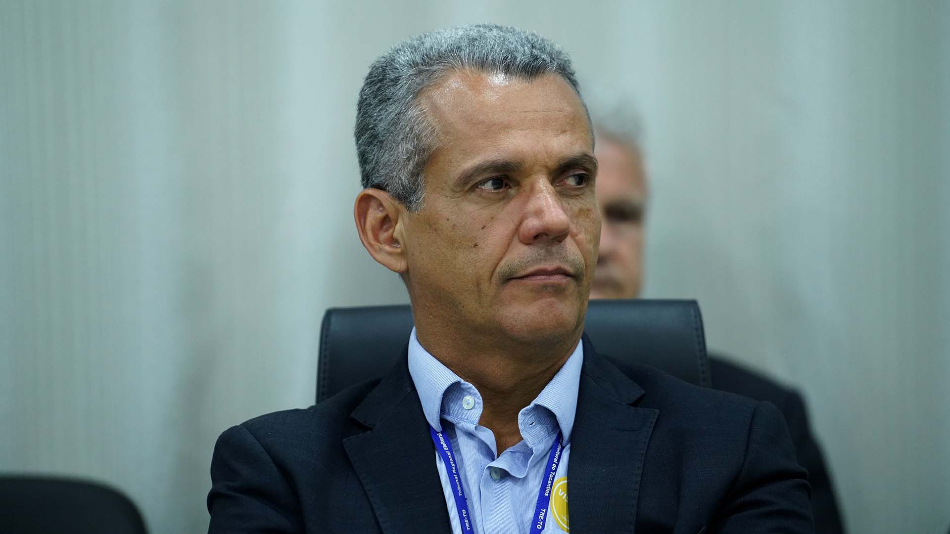 Fotos: Rondinelli Ribeiro Equipes de transição reunidas numa sala, com mesas brancas em formato em U cadeiras pretas; ao fundo a atual presidente do TJTO e a presidente eleita (esq)