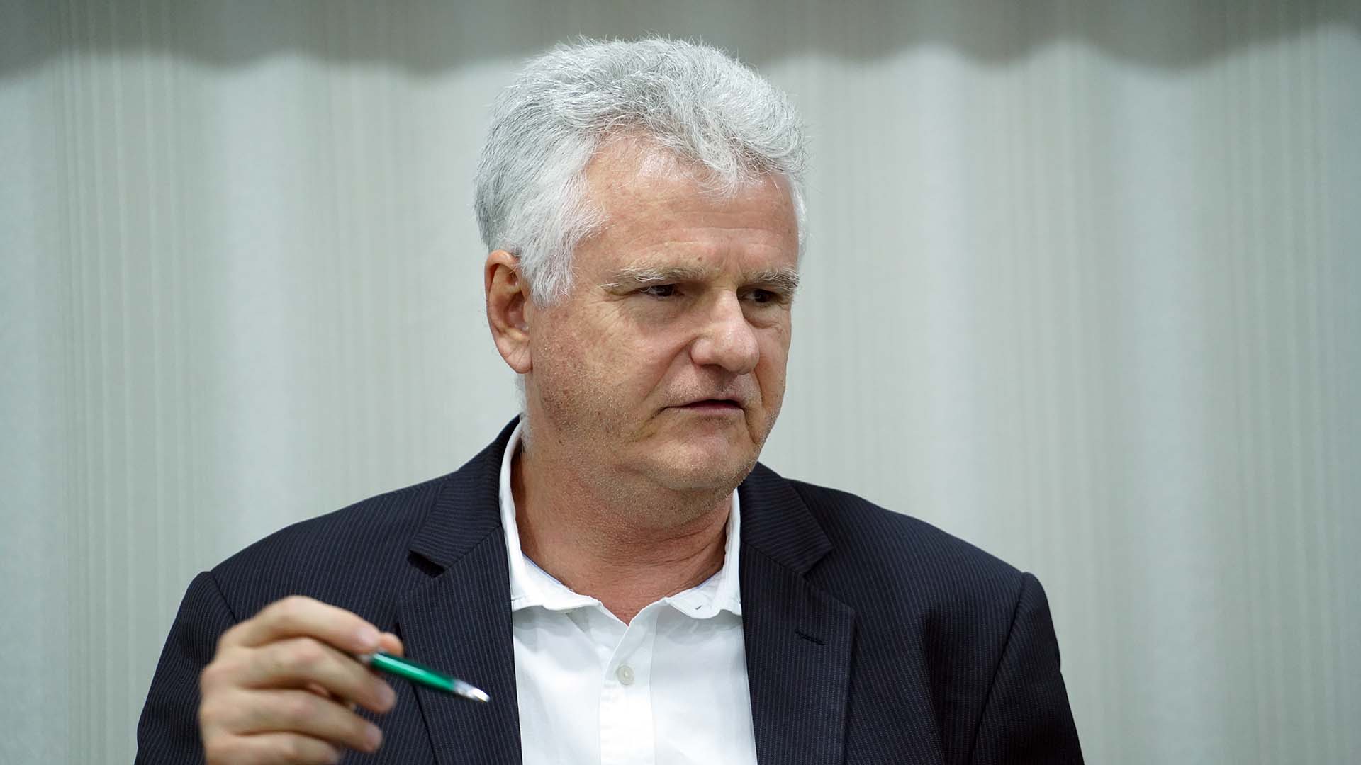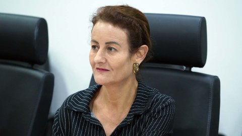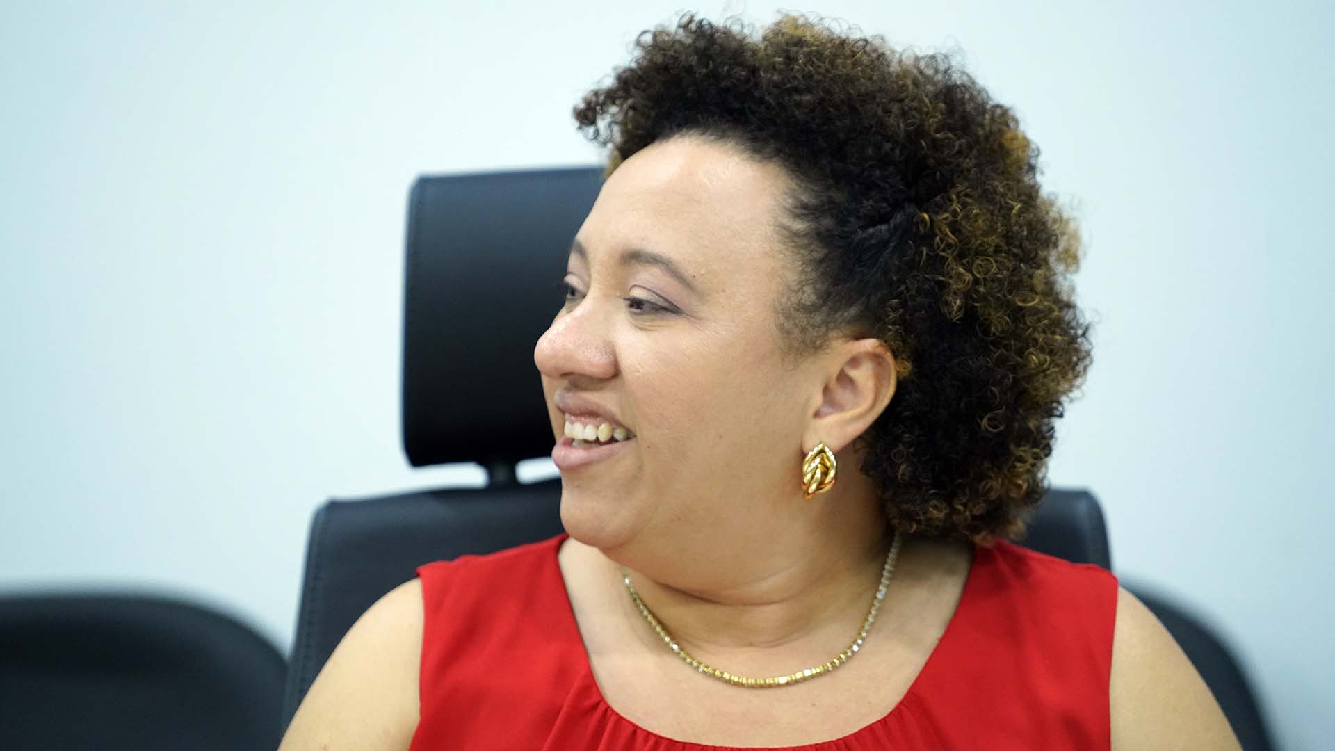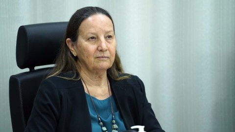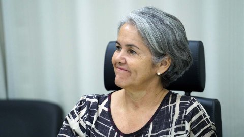 desembargadora Etelvina aparece sentada; ela está de roupa e colar marrom; usa óculos e está segurando uma canela