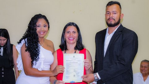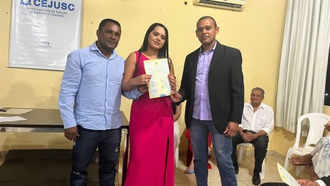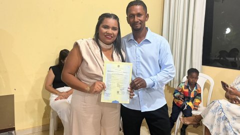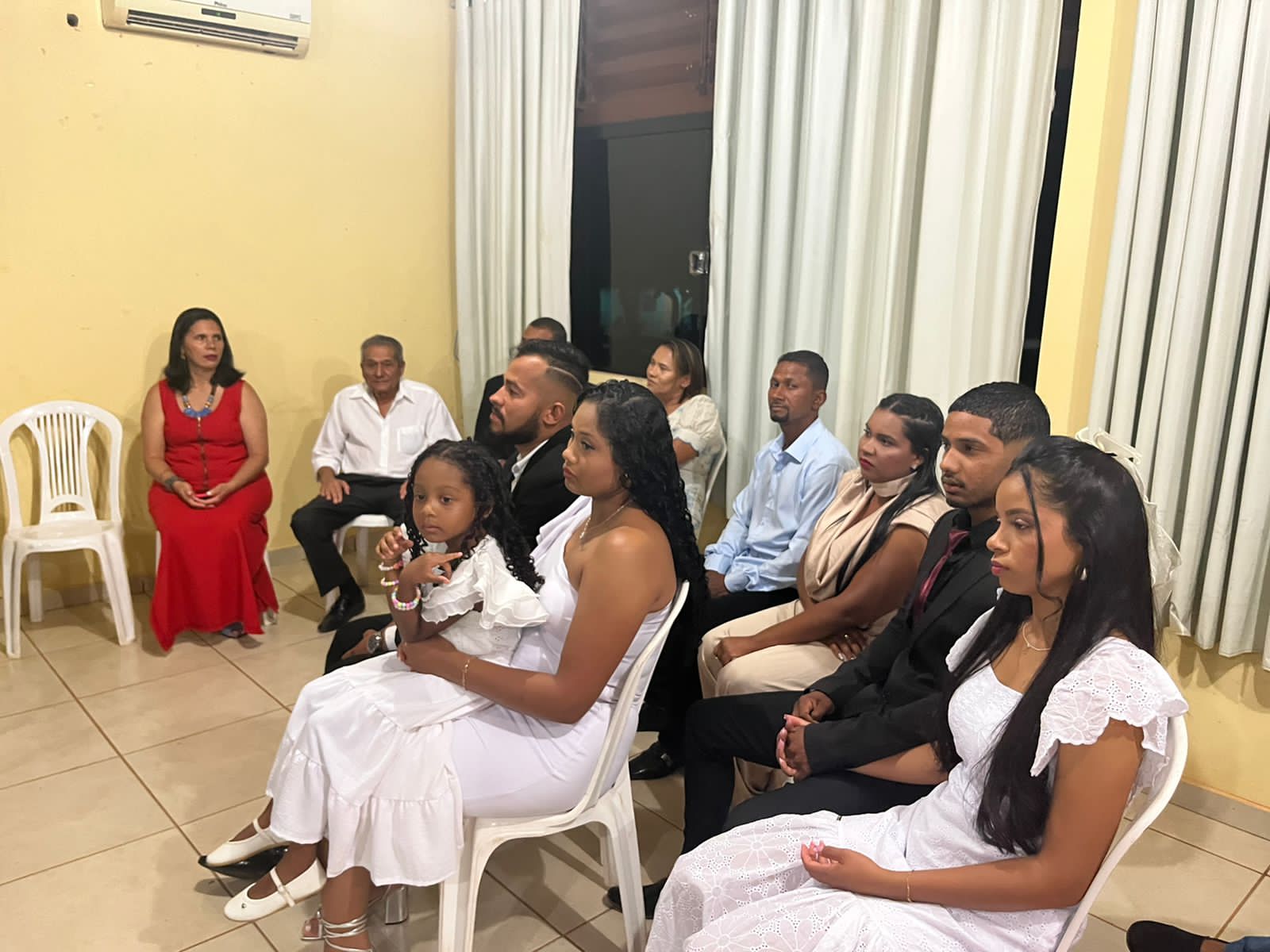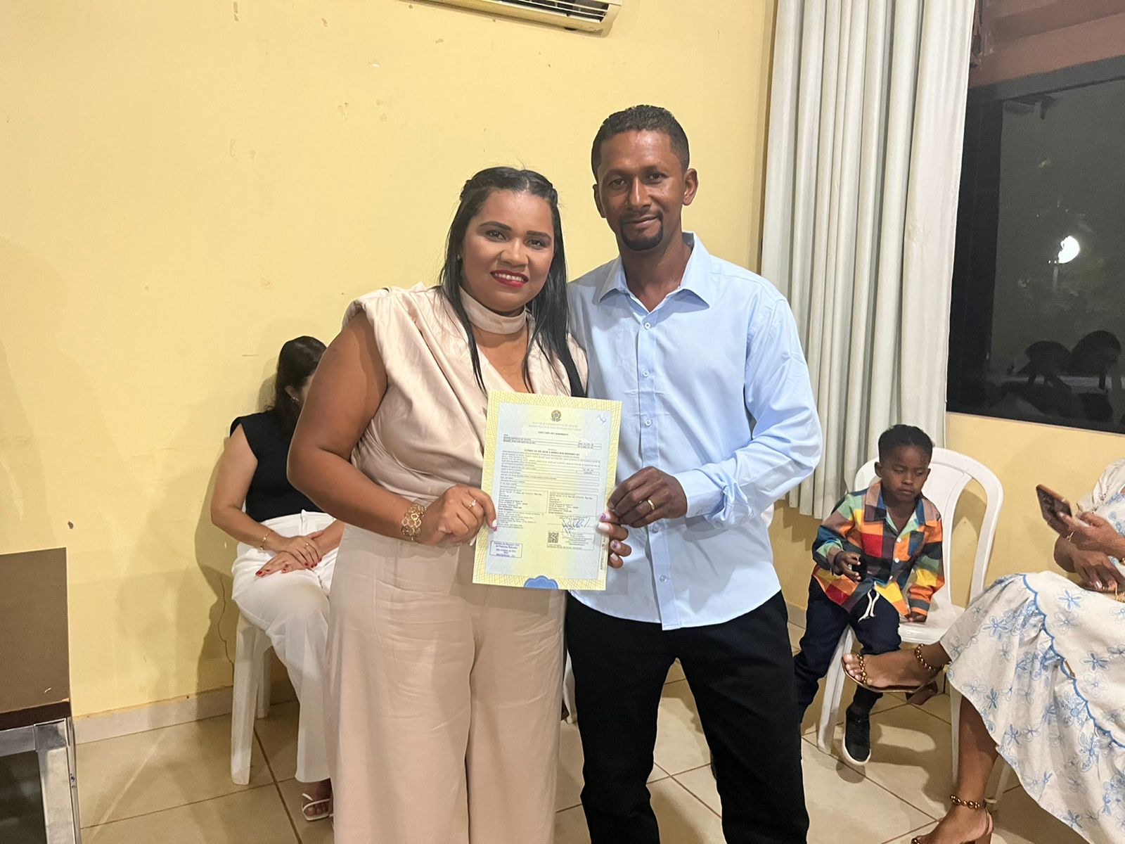 Ela e o noivo Luciano Mamedio dos Santos, ambos com 23 anos, foram um dos sete casais que disseram sim, na última sexta-feira (16/8). O palco do auditório do Centro de Atendimento ao Turista (CAT) foi o cenário escolhido e preparado para receber a cerimônia do Casamento Comunitário realizada por intermédio do Justiça Bem Aqui juiz Sândalo Bueno do Nascimento - Ponto de Inclusão Digital (PID) de Mateiros, a 306 Km de Palmas.