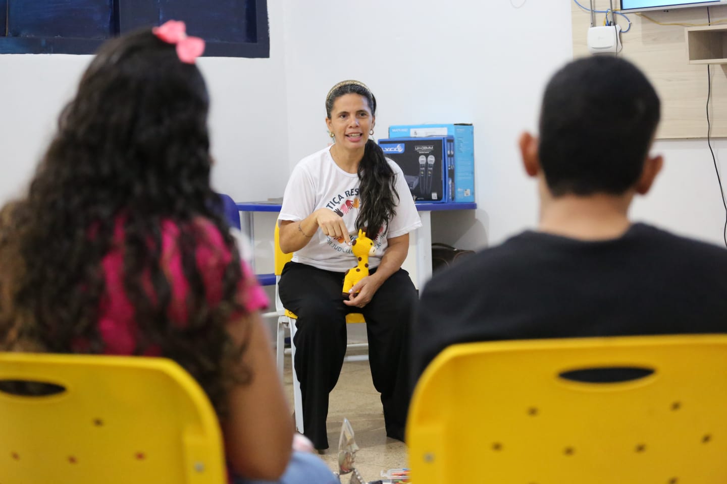 Para iniciar o círculo, Luciane Prado, conscientizou os jovens e familiares sobre o poder da fala e da escuta. “As duas coisas são poderosas, o poder da fala e o poder da escuta, e tudo nesse círculo é um convite, não há imposição, só fale se quiser. A intenção da Justiça Restaurativa é sentar com a comunidade para tentar, juntos, achar soluções, no caso aqui hoje, com os jovens e seus familiares”, explicou.
