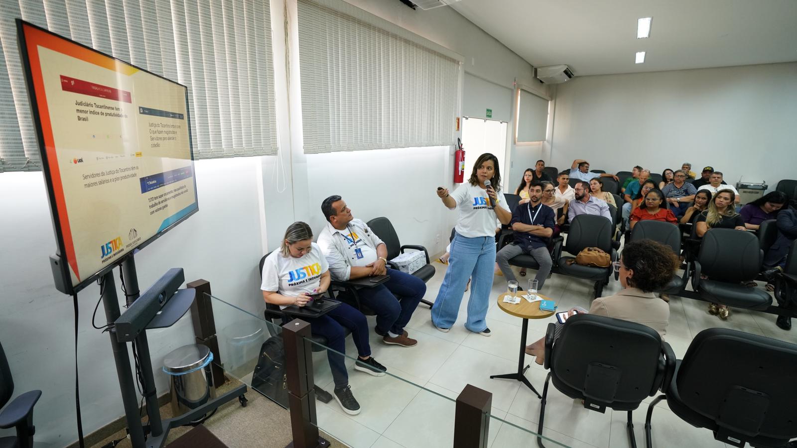 Fotos:Rondinelli Ribeiro Fotografia colorida que a presidente do TJTO fala para uma plateia atenta em Colinas