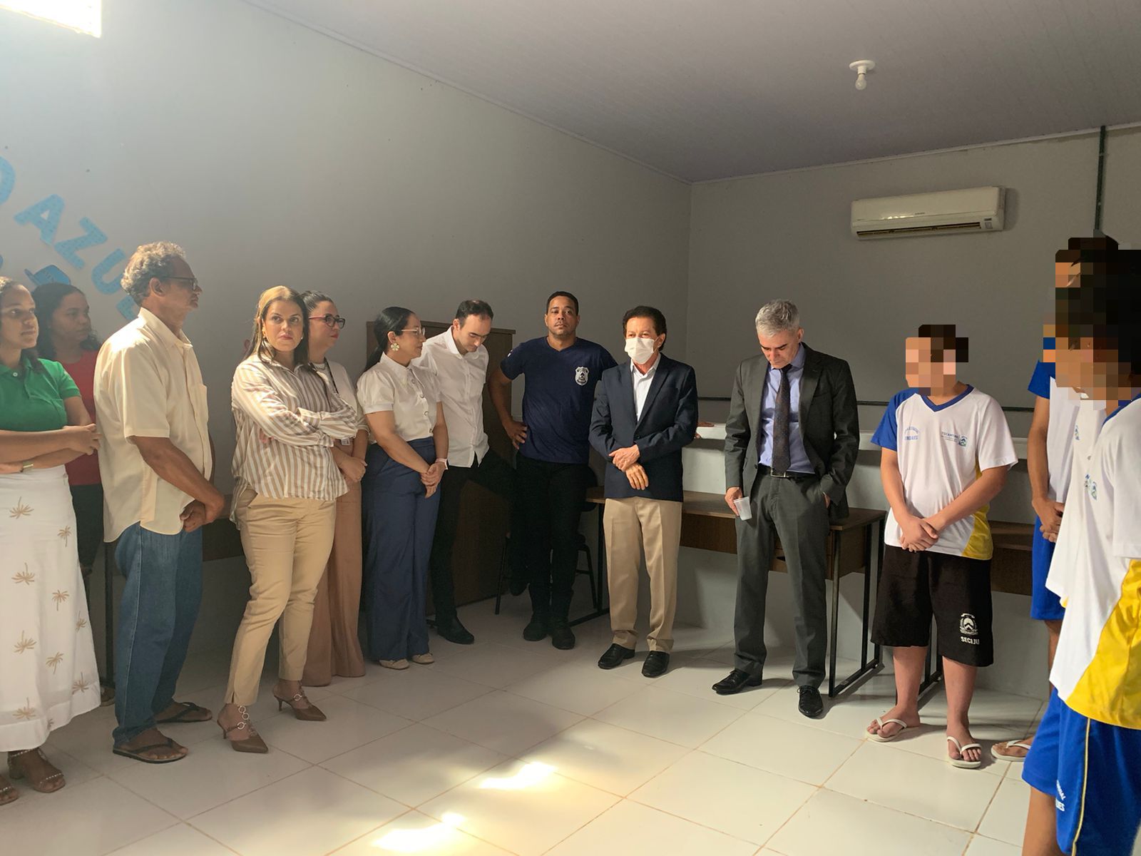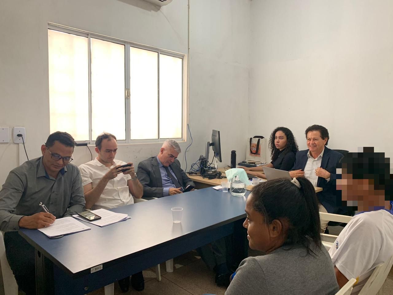 imagem aberta de uma das audiências realizadas em Araguaína; juiz aparece sentado, na cabeceira da mesa (ele usa máscara), e ao seu lado servidores, socioeducandos e familiares