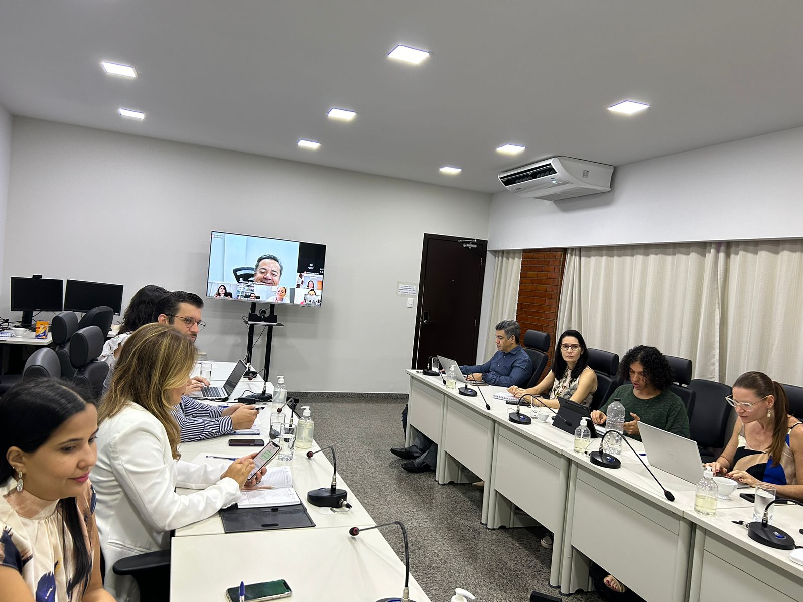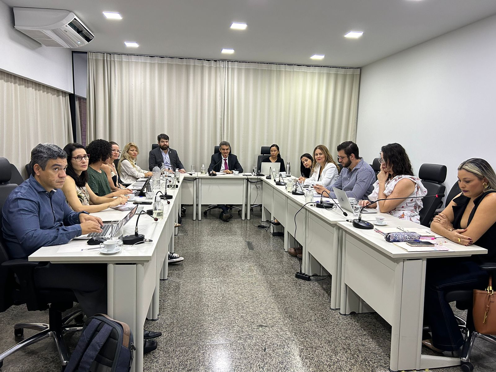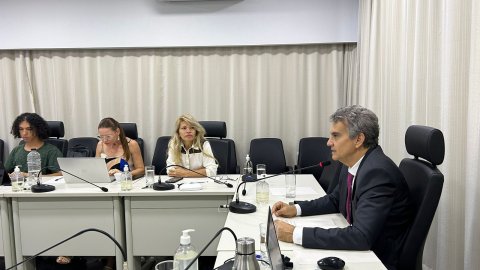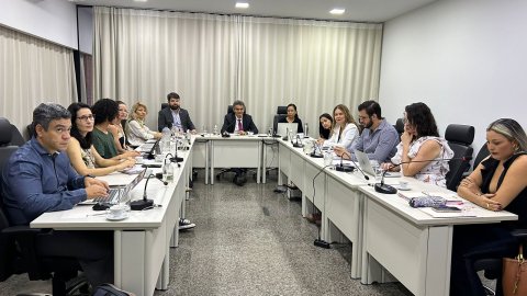Divulgação Homens e mulheres sentados em torno de mesa branca em formato U, com microfones individuais, durante reunião sobre pessoas com transtorno mental em conflito com a lei, numa sala de paredes brancas com cortina branca