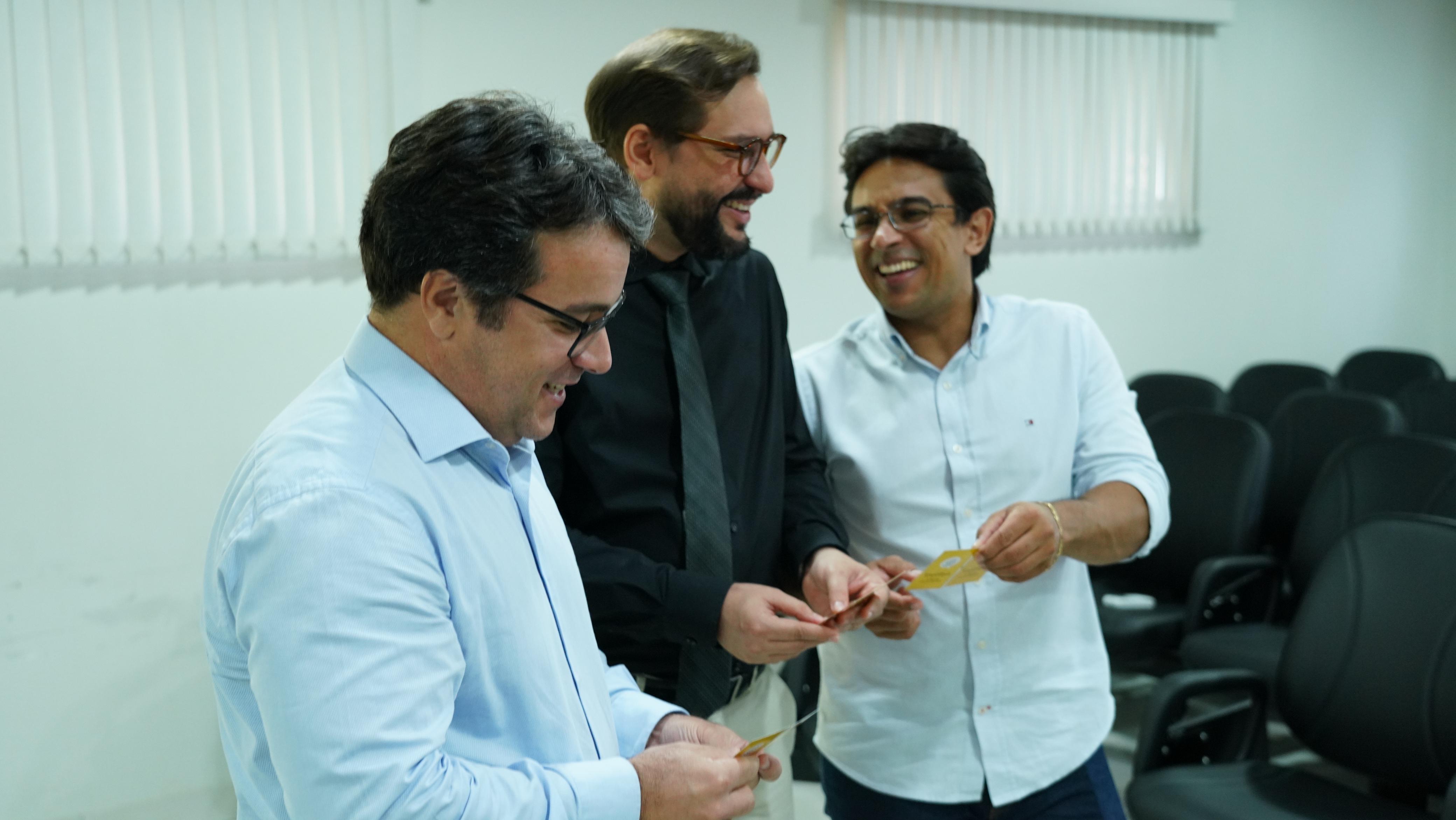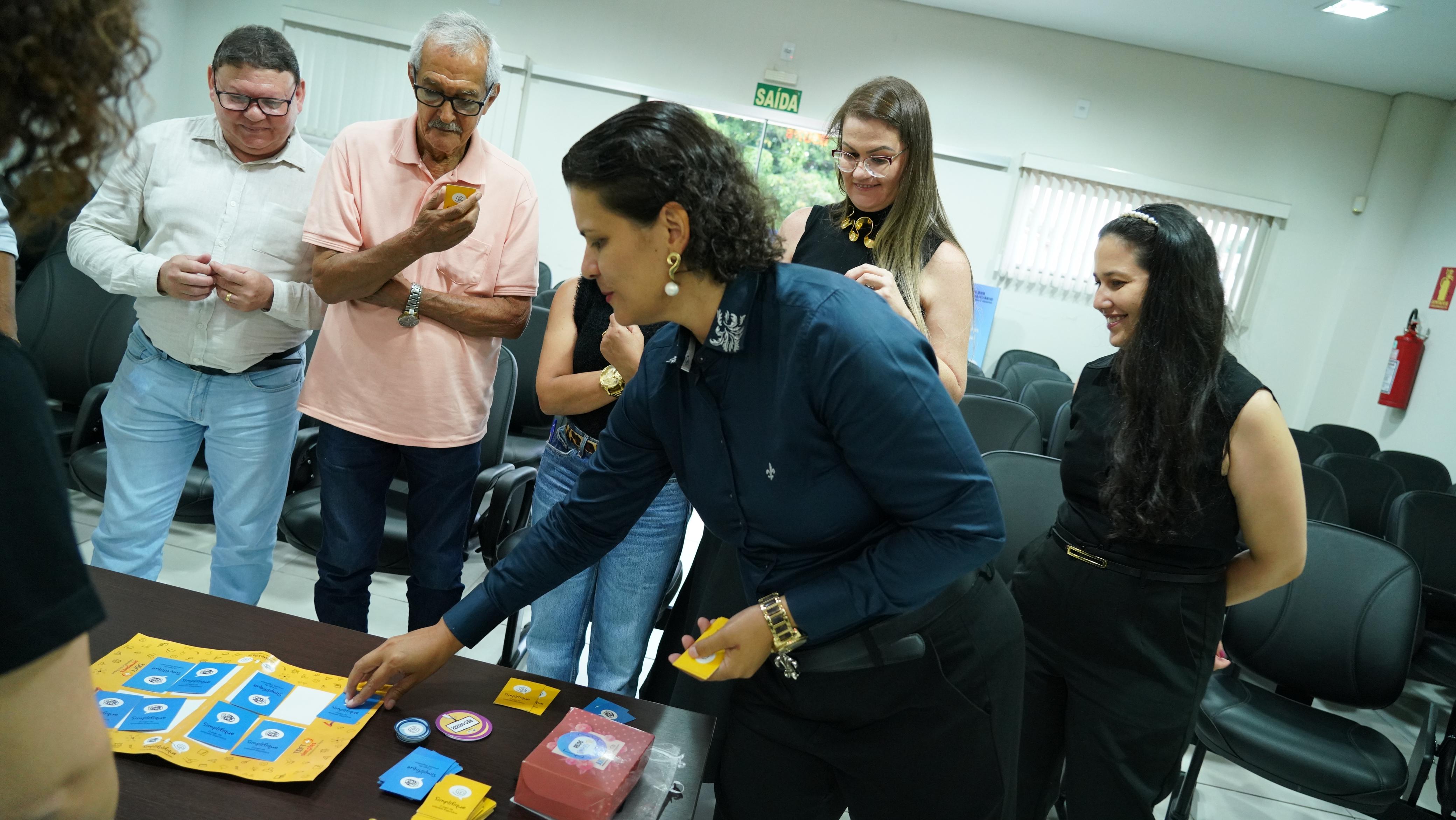 Rondinelli Ribeiro Fotografia colorida onde um grande grupo de homens e mulheres se reúnem em volta de uma mesa cinza com o topo marrom escuro. Todos seguram um cartão amarelo, e estão em uma sala branca com duas portas no fundo.