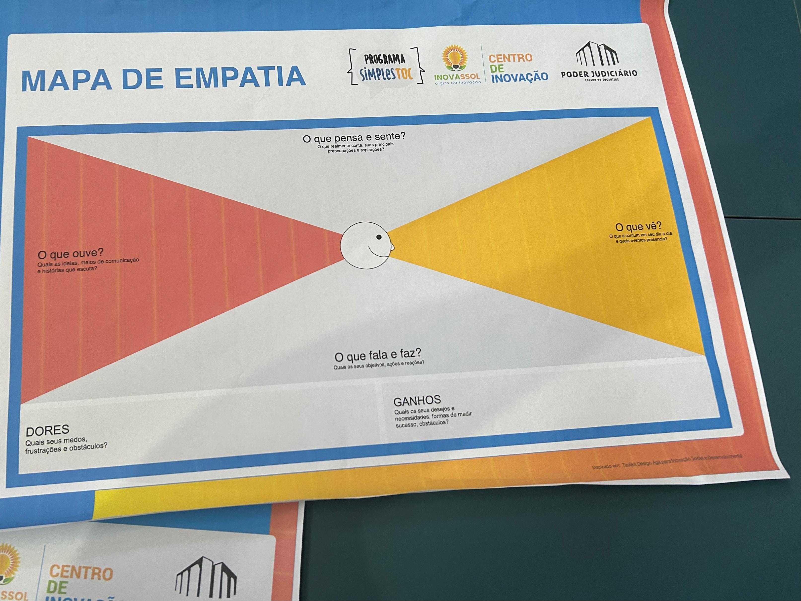 Após identificada a problemática, se passa para a segunda etapa, o Mapa de Empatia, que discute o problema a partir da perspectiva do(a) servidor(a), entendendo o que ele(a) ouve, sente, vê e faz em relação a isso, e como ele interfere dentro de sua rotina.