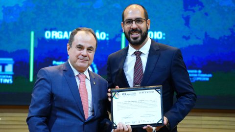 Ao final das apresentações, os palestrantes foram homenageados em reconhecimento às suas contribuições para o aprimoramento do sistema de justiça. A homenagem foi entregue pelo desembargador Marco Villas Boas.