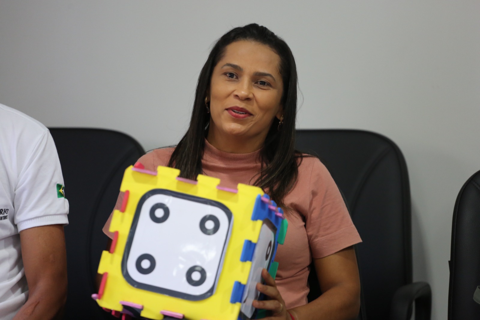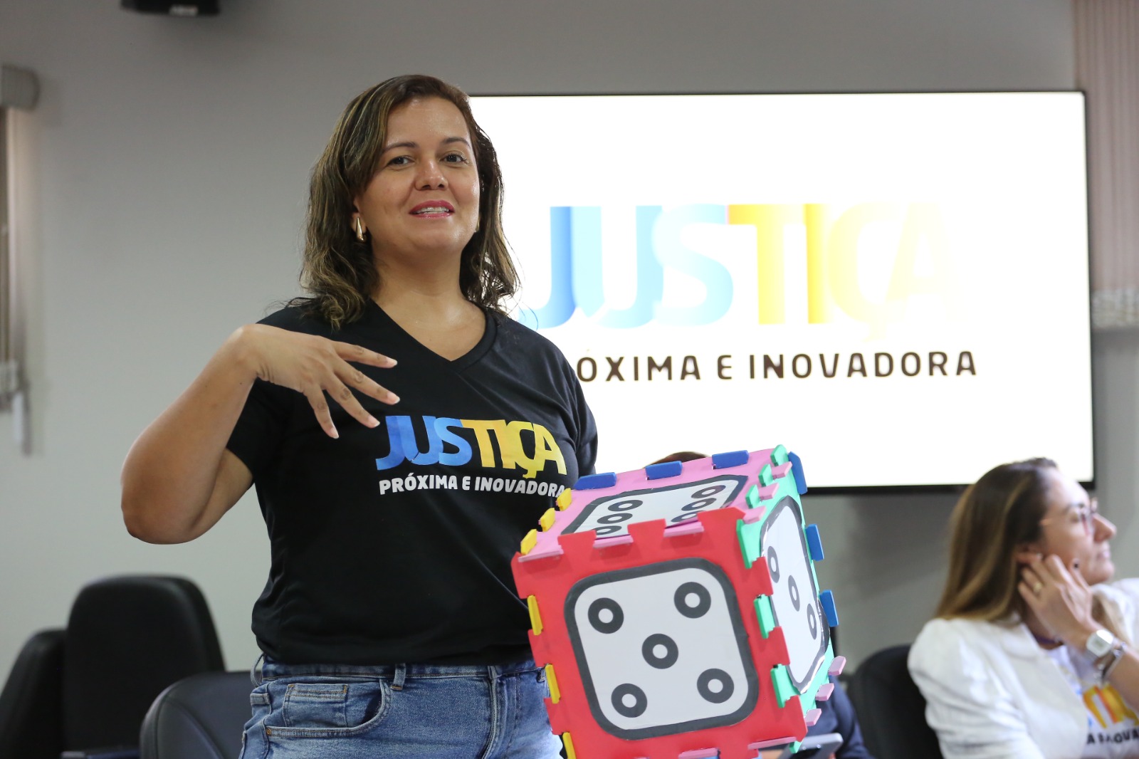Cessão, indenizações, assédio, comunicação institucional entre outros pontos também foram destacados através de um jogo de dados de perguntas e respostas com a seguinte dinâmica: os integrantes da Comarca jogavam o dado e, de acordo com o número sorteado e a temática correspondida, diretores e diretoras setoriais presentes na comitiva junto à presidência, respondiam aos questionamentos.