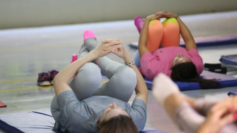 servidoras deitadas em tapetes praticando pilates