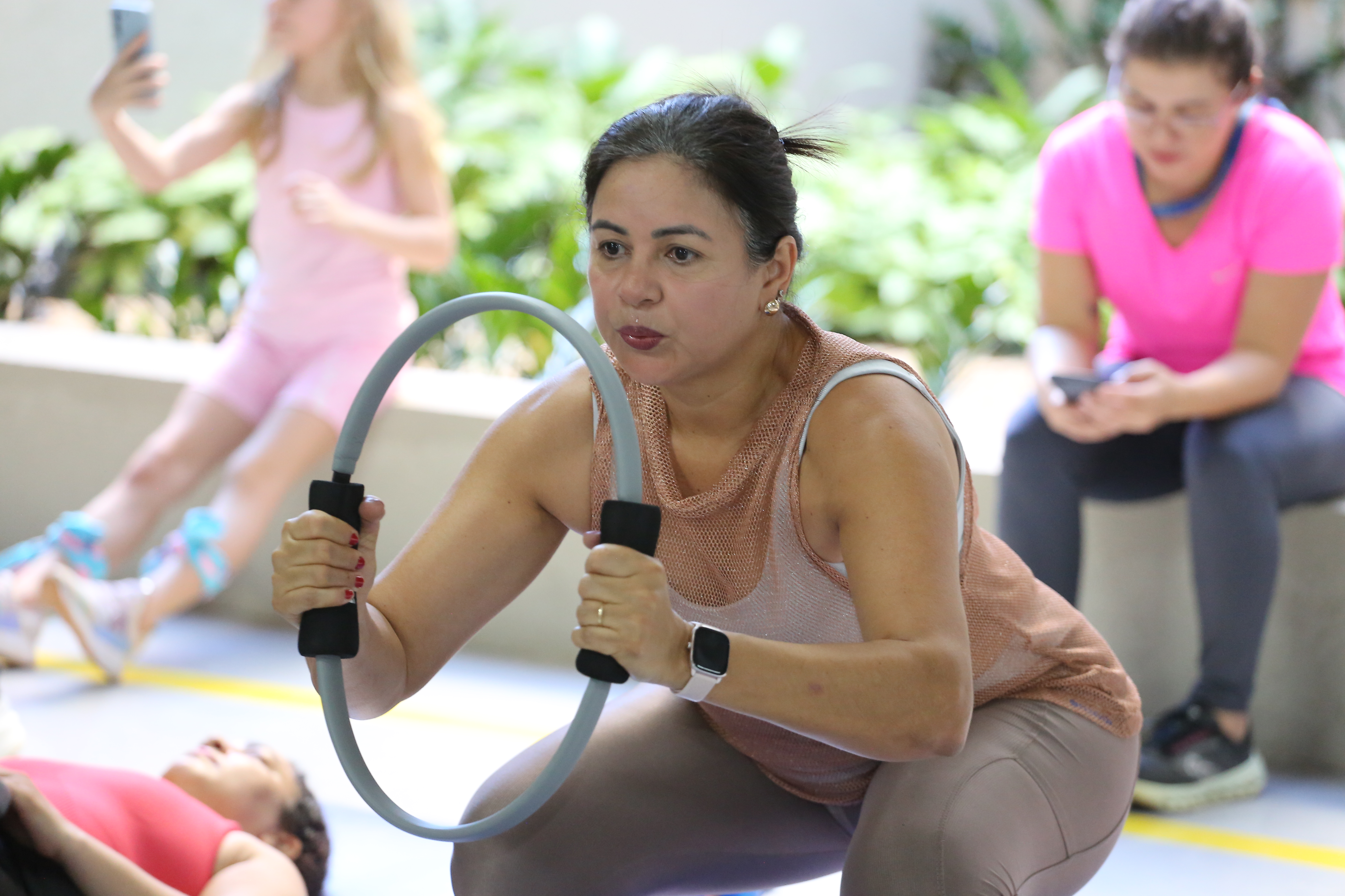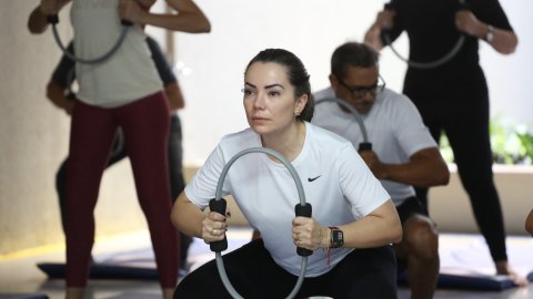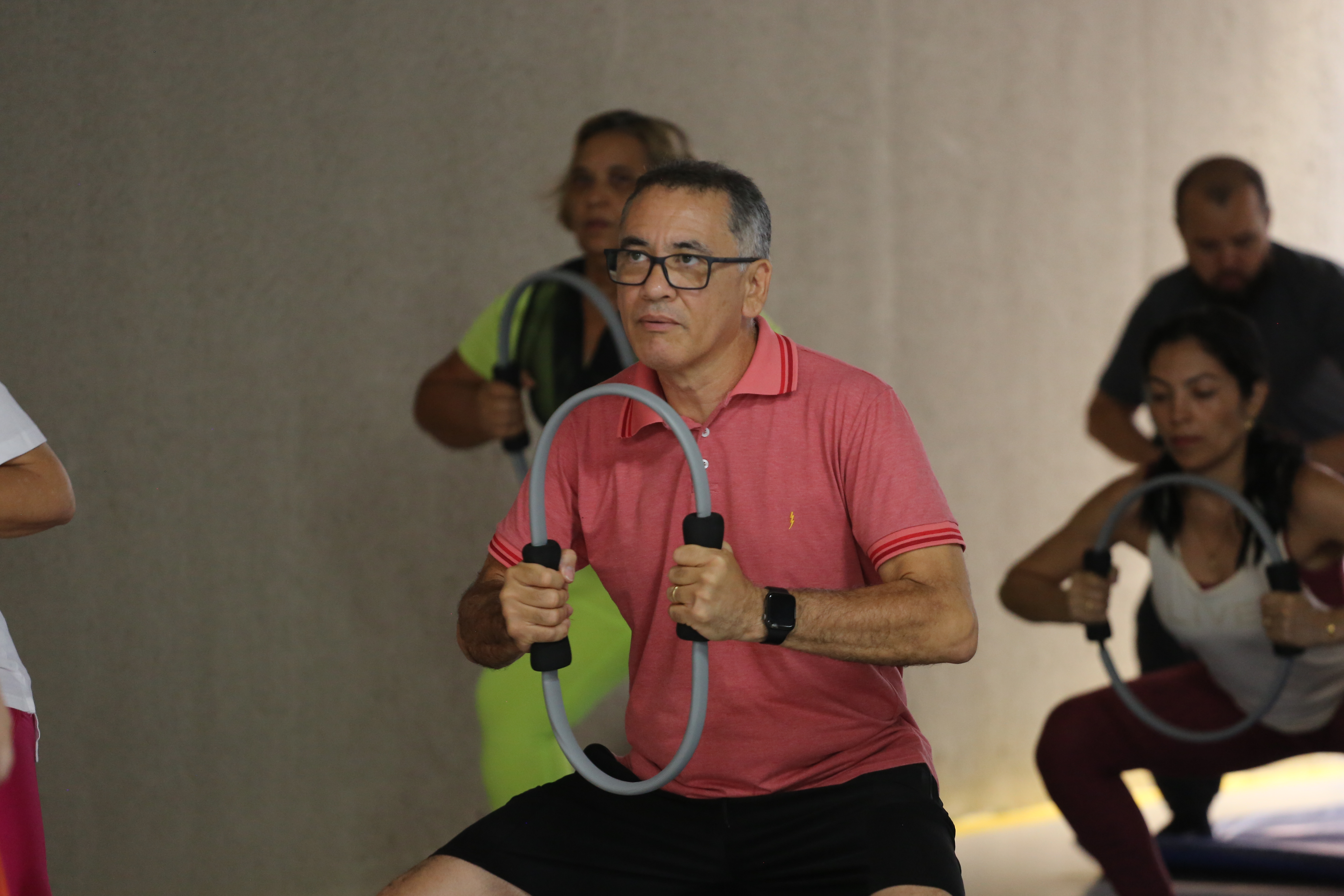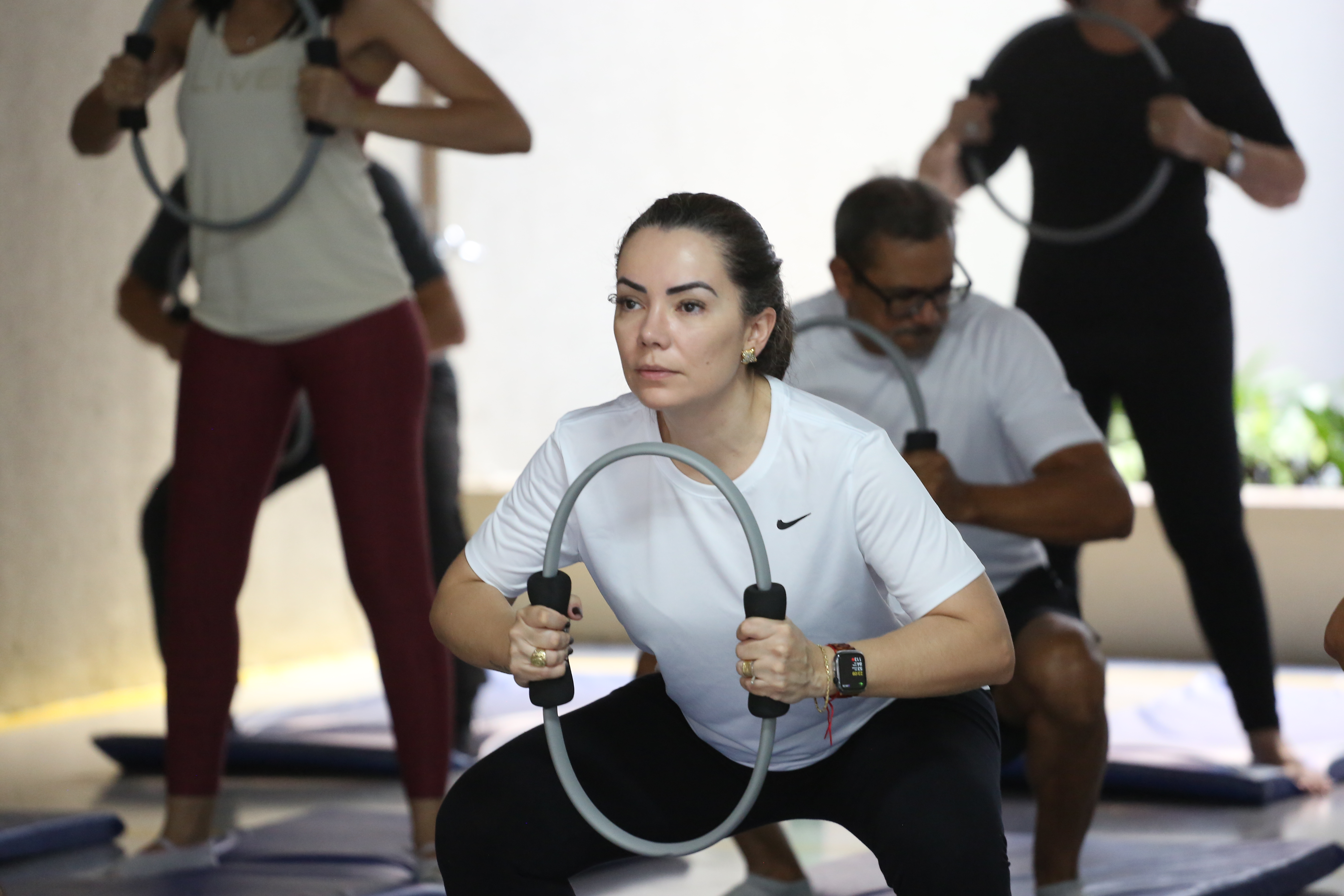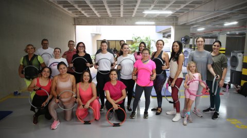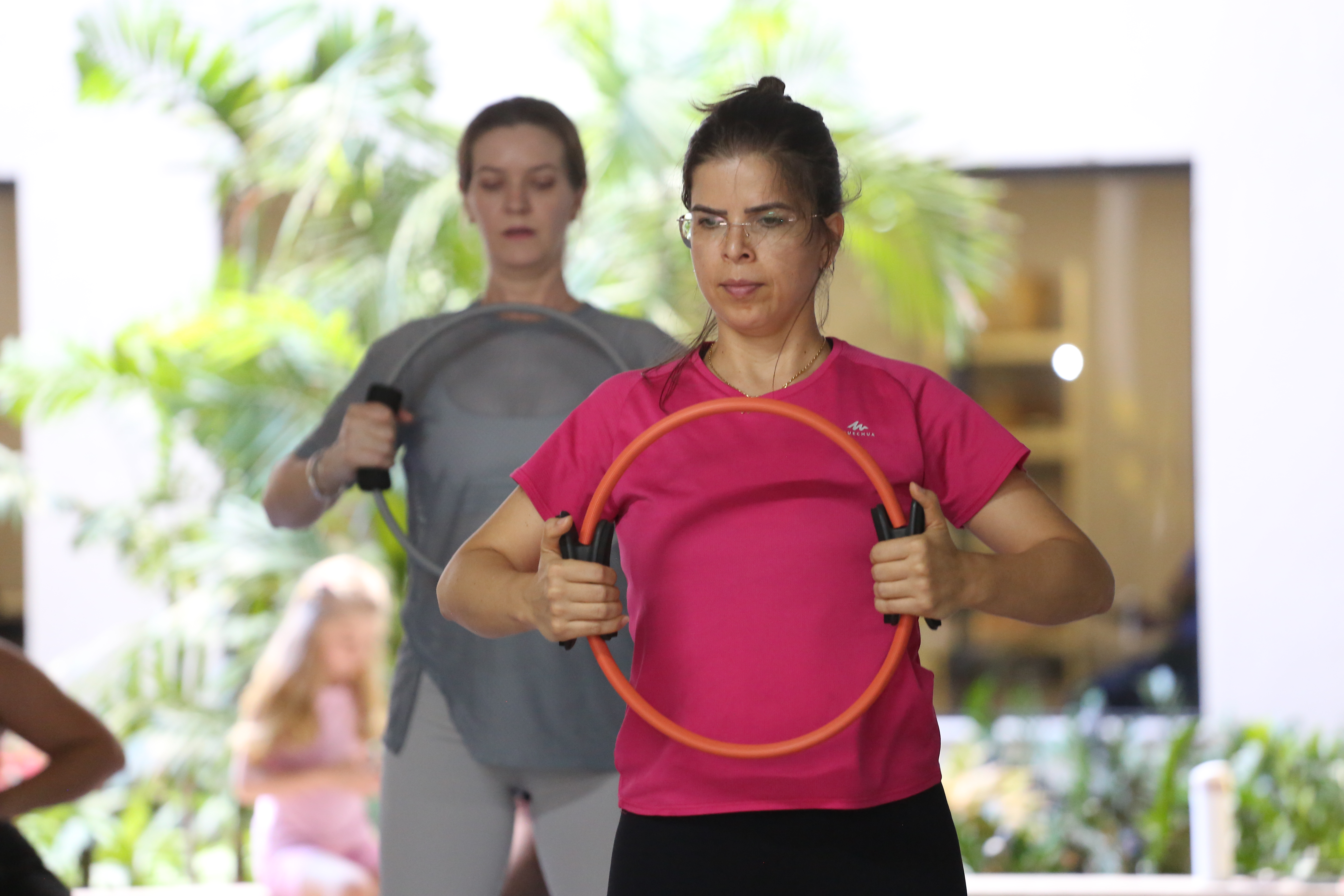 Desembargadora Etelvina, de roupa preta, à esquerda, e a médica Elaine, de branco, à direita, se exercitando com uma argola nas mãos