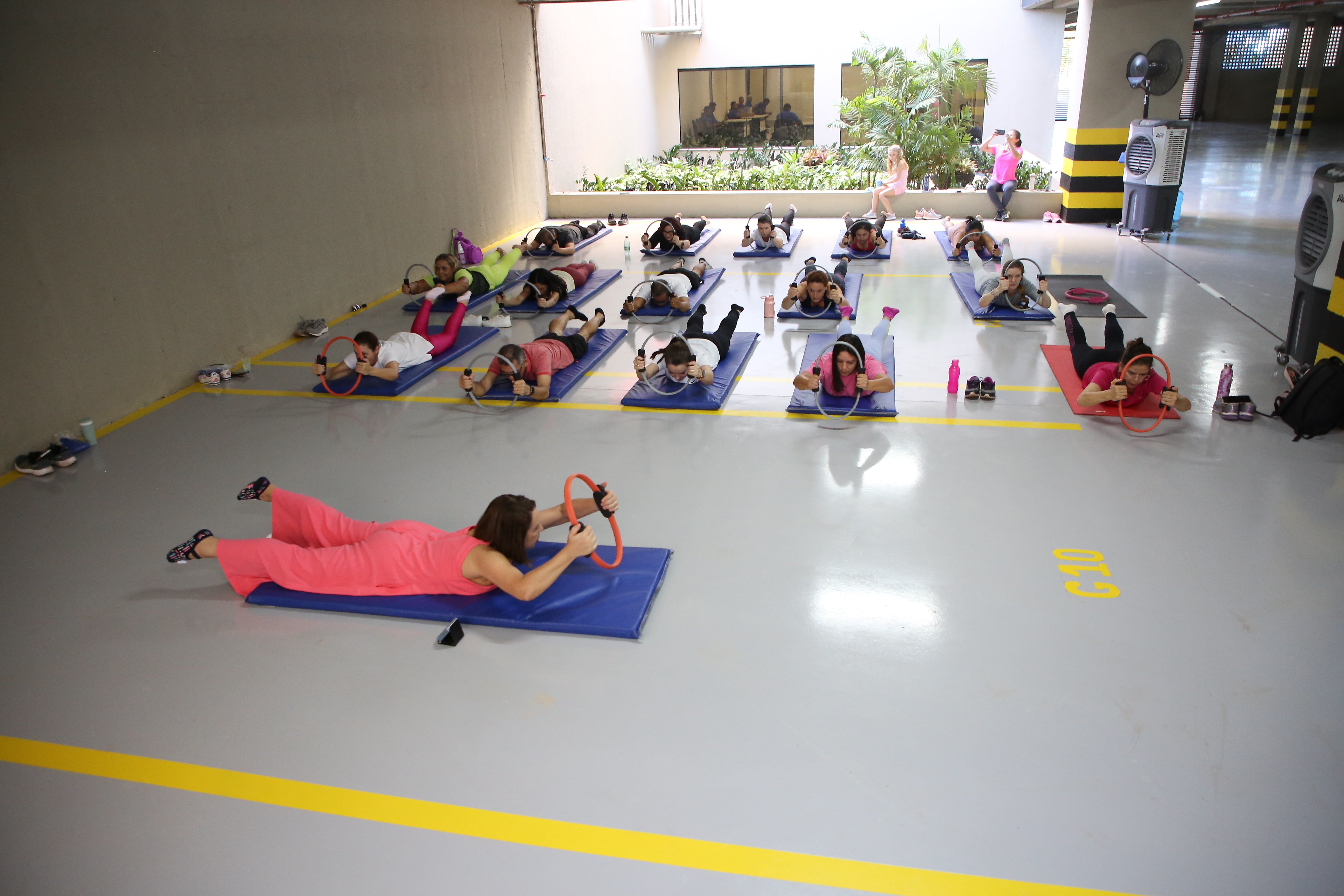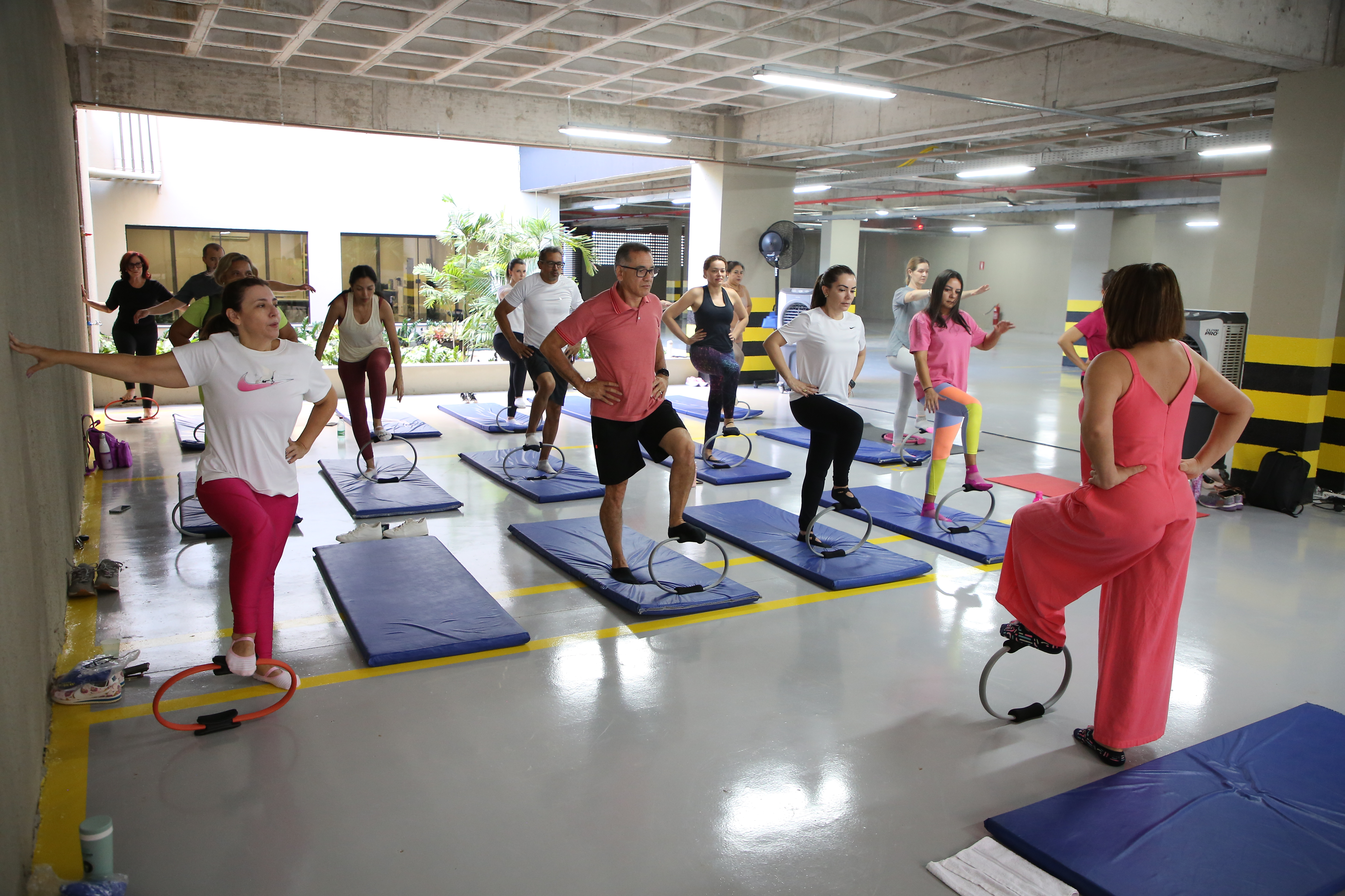 Sala com vários servidores se exercitando em tapetes azuis