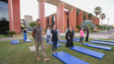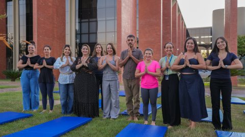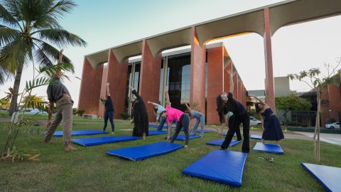 Lucas Nascimento Várias pessoas praticando yoga no gramado em frente ao prédio do Tribunal de Justiça, na imagem aparecem tapetes azuis e uma palmeira à esquerda