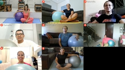 Várias pessoas em uma sala se exercitando com tapetes e bolas coloridas