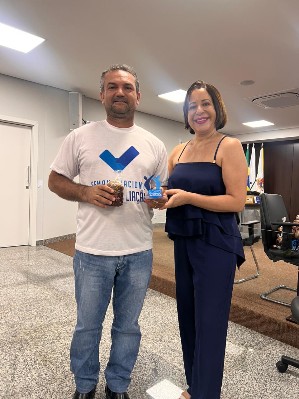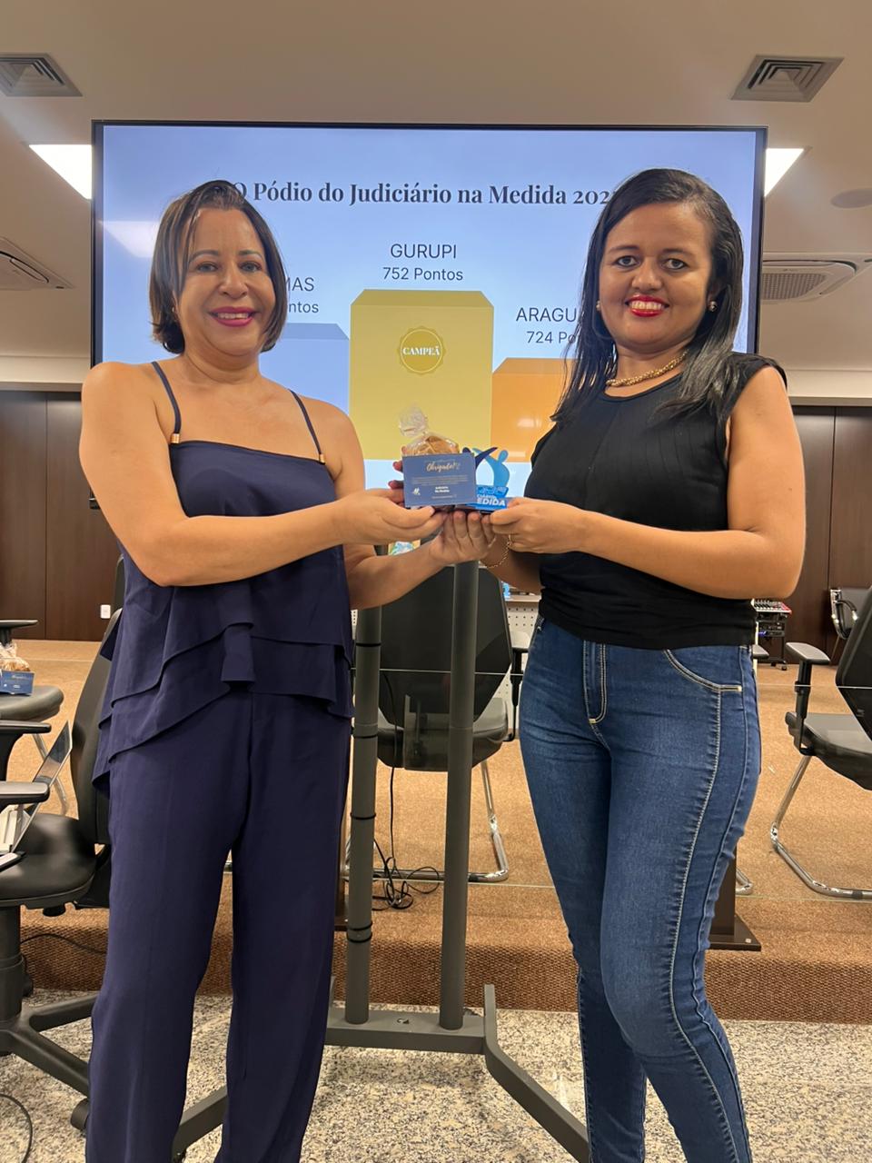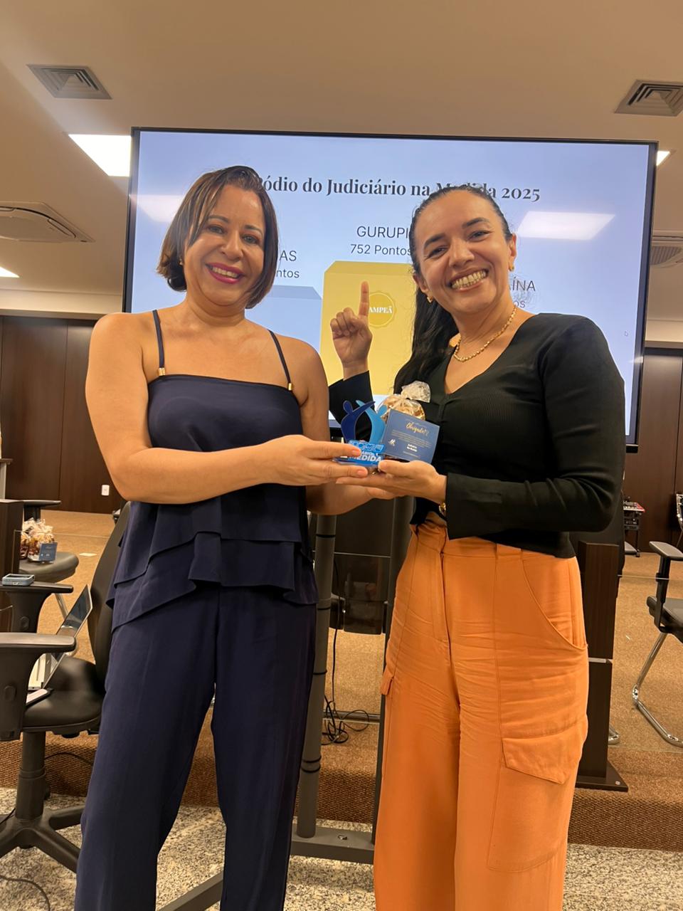 Sandra e a servidora Jaiane posam para foto em auditório durante o encerramento do Programa Judiciário na Medida 2025. A servidora, à direita, recebe um prêmio simbólico, enquanto, ao fundo, um telão exibe a identificação dos líderes das comarcas participantes.