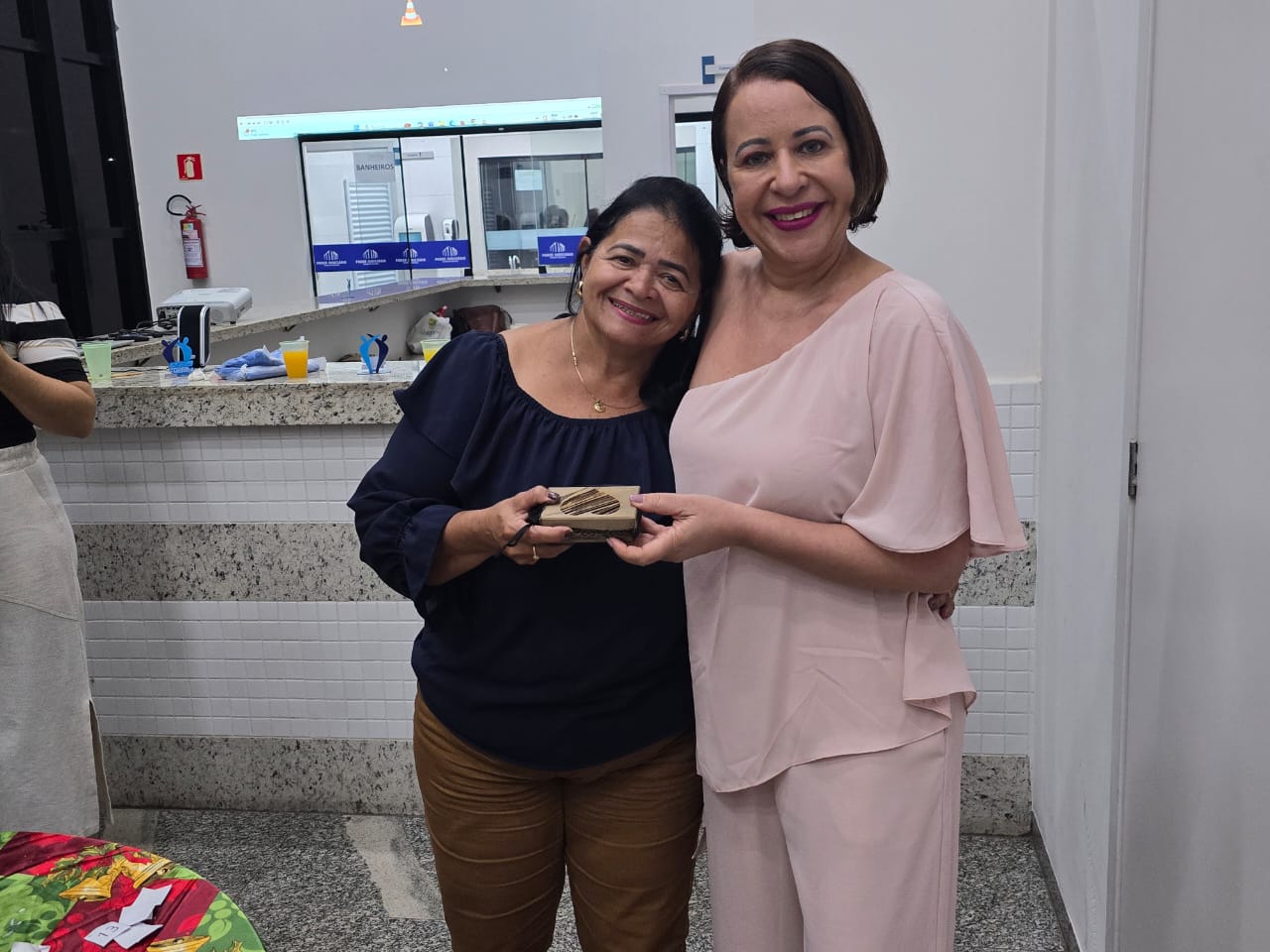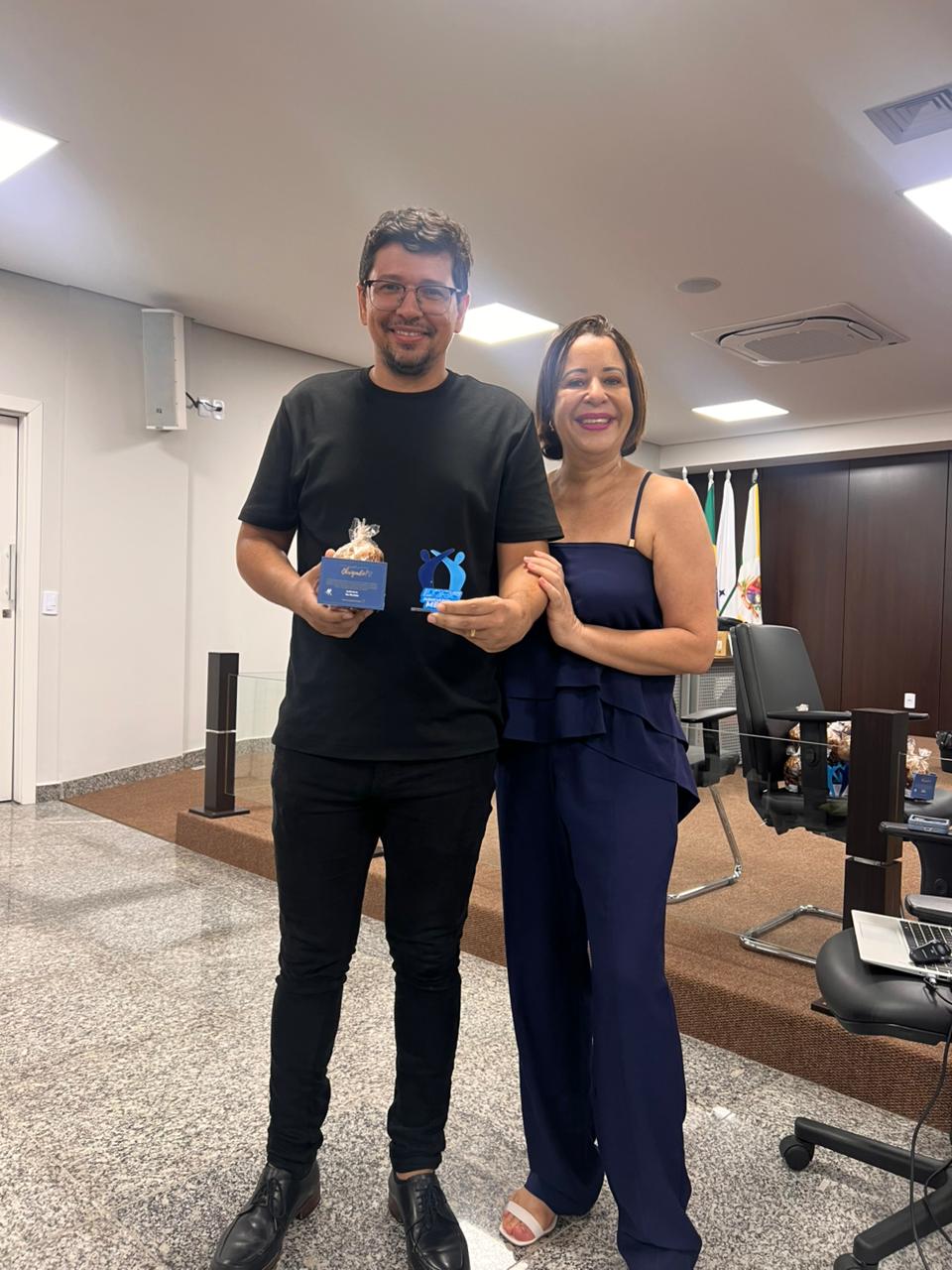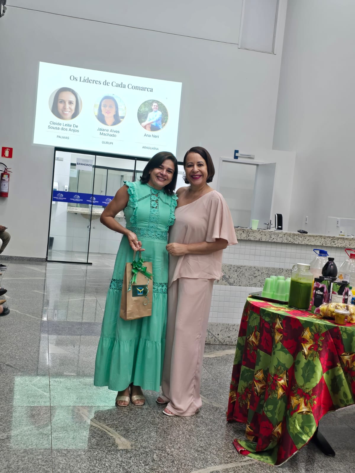 Sandra e a servidora Jaiane posam para foto em auditório durante o encerramento do Programa Judiciário na Medida 2025. A servidora, à direita, recebe um prêmio simbólico, enquanto, ao fundo, um telão exibe a identificação dos líderes das comarcas participantes.