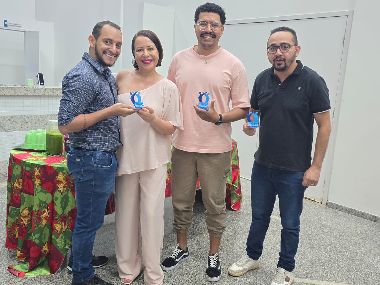 Grupo de servidores(as) posa para foto em ambiente interno do fórum, segurando troféus azuis do Programa Judiciário na Medida, em registro do encerramento das atividades.