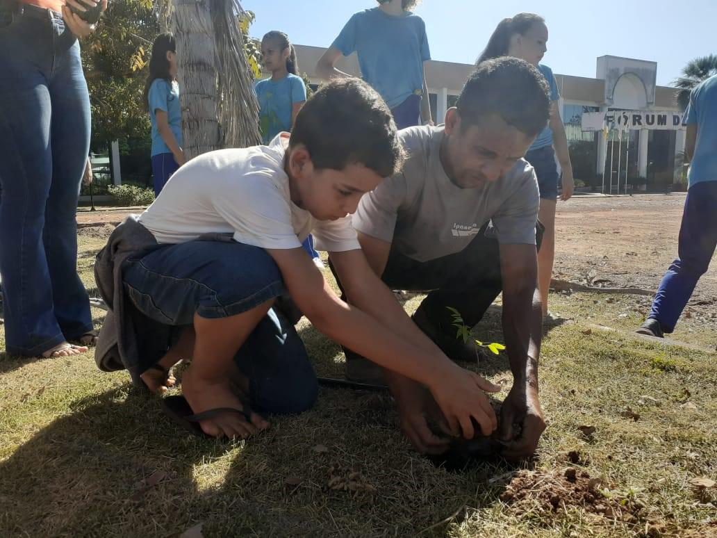 Na última terça-feira (6/6), o espaço público localizado em frente ao fórum da cidade recebeu o plantio de 20 mudas de árvores frutíferas. A iniciativa foi uma ação conjunta entre a diretoria da Comarca, por meio do juiz Fábio Costa Gonzaga, e alunos do 6º ano da Escola Municipal Sossego da Mamãe.