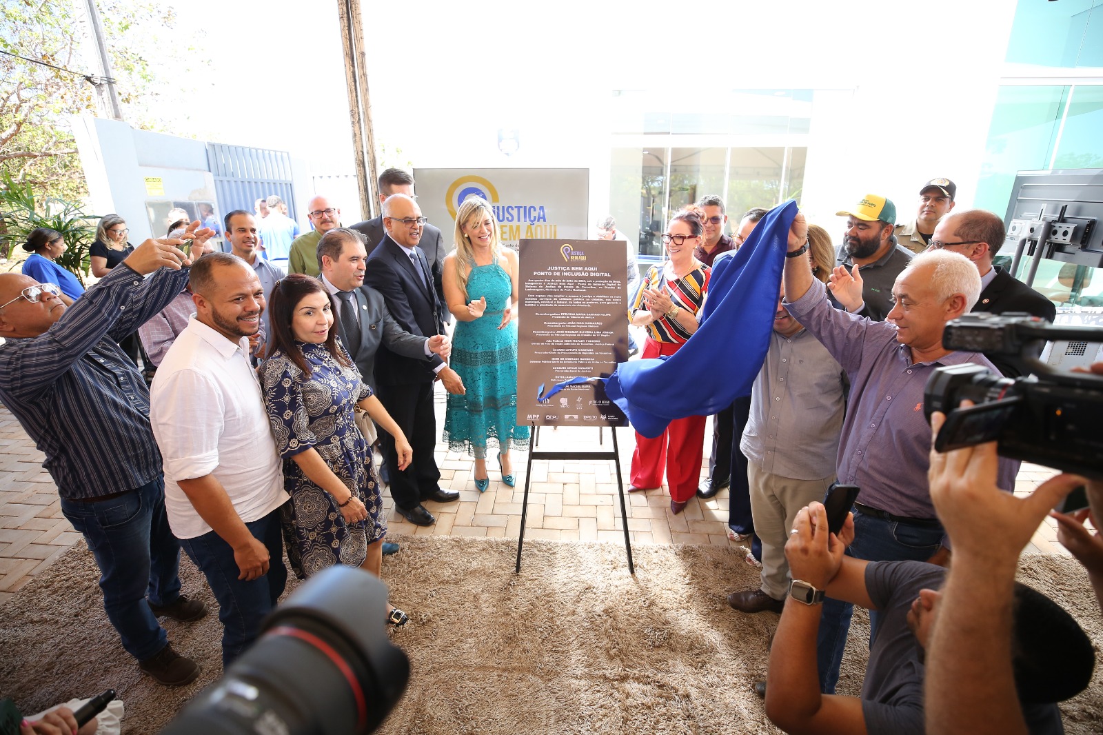 Elias Oliveira Homens e mulheres em torno de placa de inauguração do Ponto de Inclusão Digital de Luzimangues