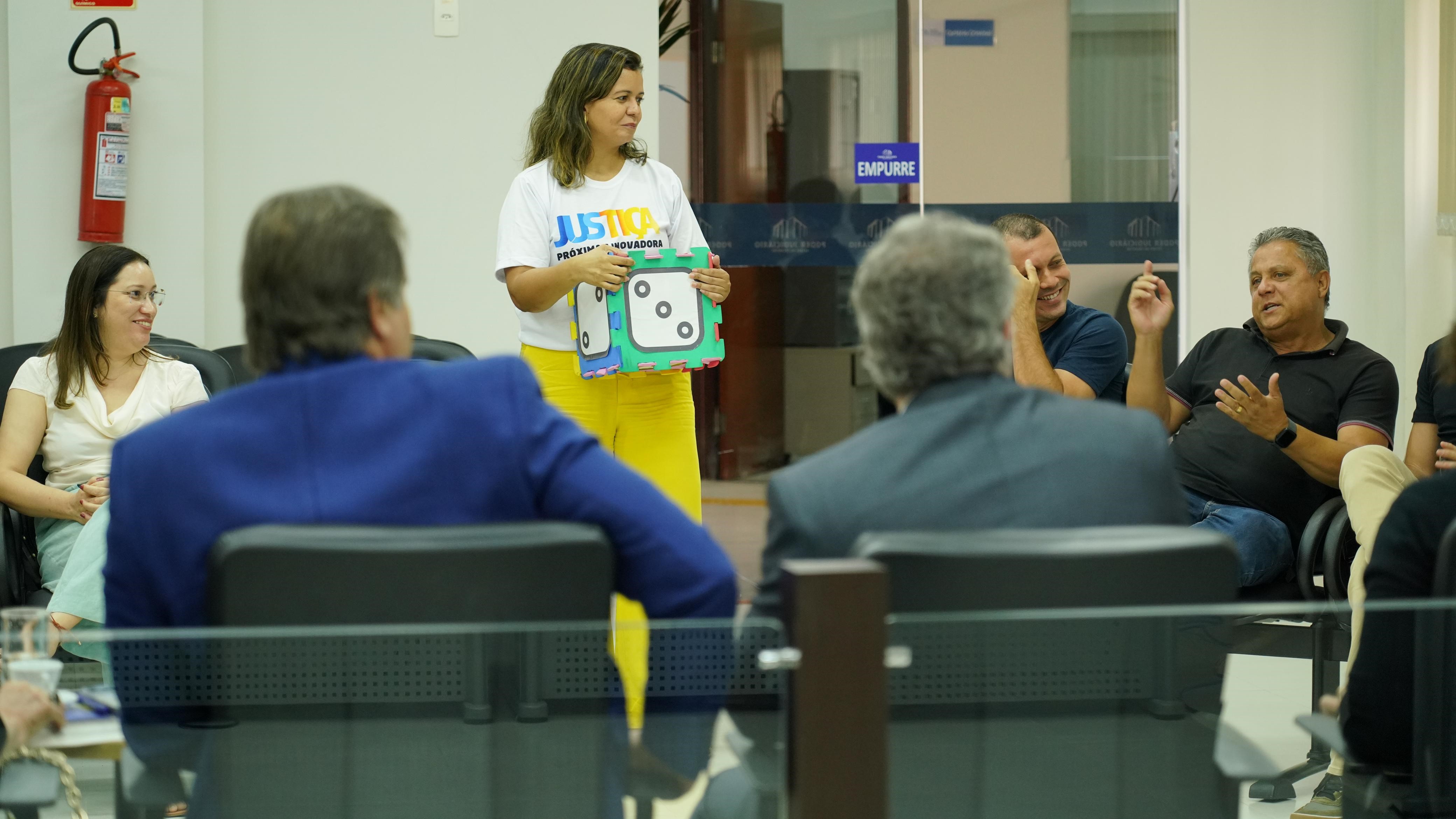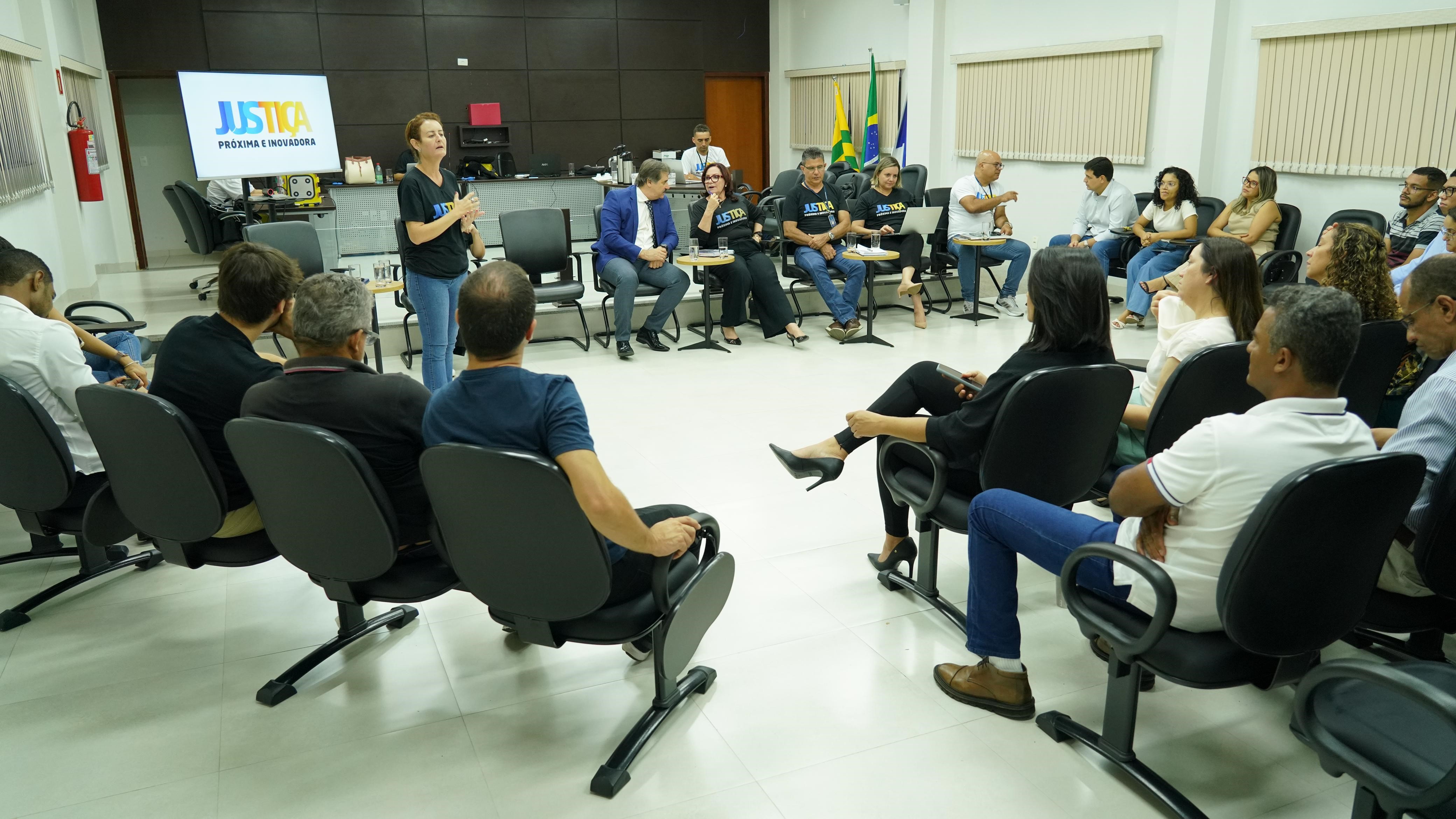 Rondinelli Ribeiro/Cecom/TJTO Grupo de pessoas em um ambiente bem iluminado, sentados em semi-círculo. No centro, a presidente do Tribunal de Justiça do Tocantins, Etelvina Maria Sampaio Felipe.