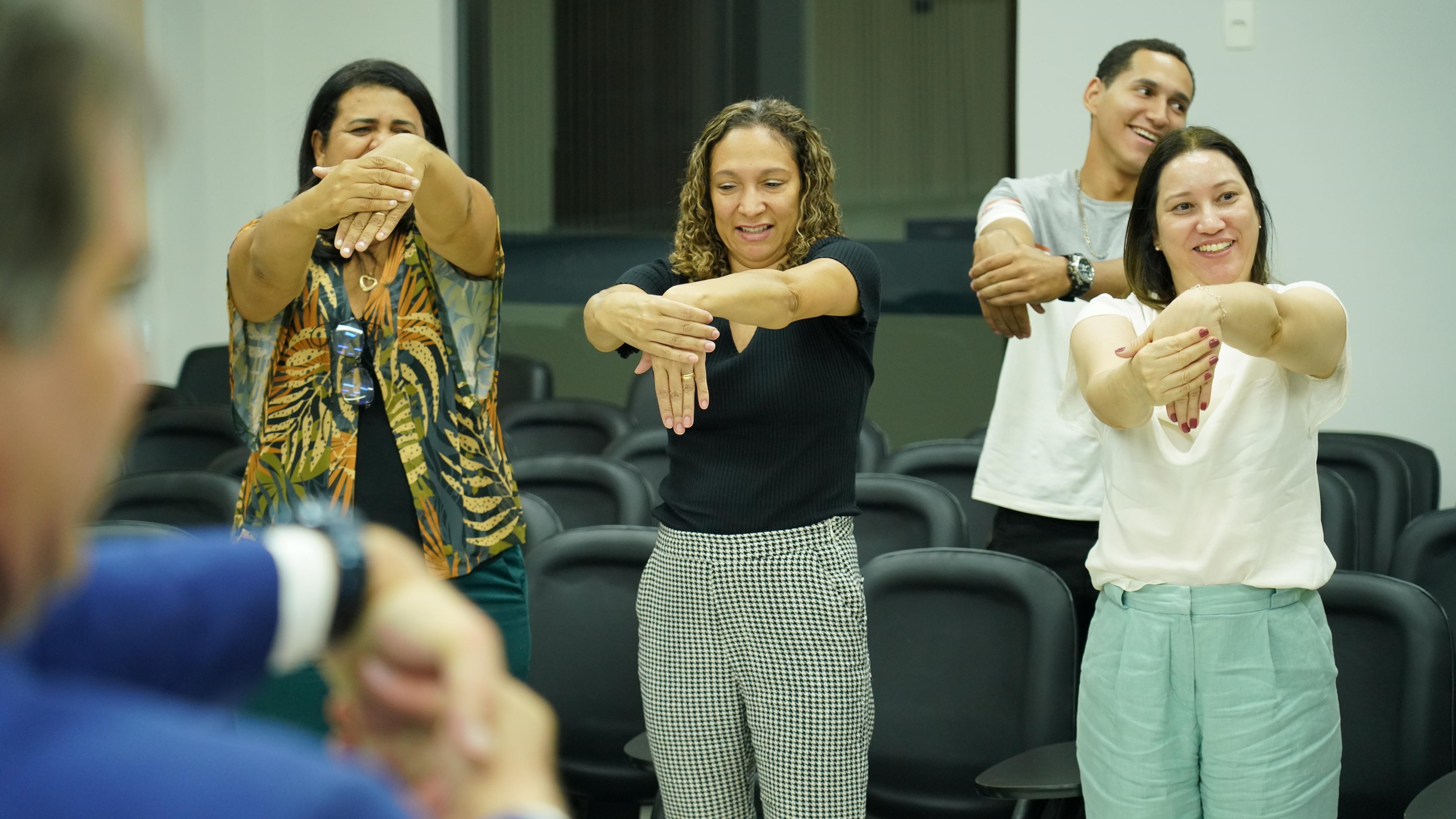 Com isso, a dinâmica foi finalizada pela fisioterapeuta do Cesau, Sandra Carvalho é o fisioterapeuta da Comarca, Rogério Dias Teixeira. “Fiquei animadíssima com a notícia de que teremos um fisioterapeuta aqui em Arraias. Sou apaixonada por fisioterapia, fiz pilates online. Não vou perder uma sessão de ginástica laboral”, disse a secretária do Cejusc, Vagna Carla Alves Costa.