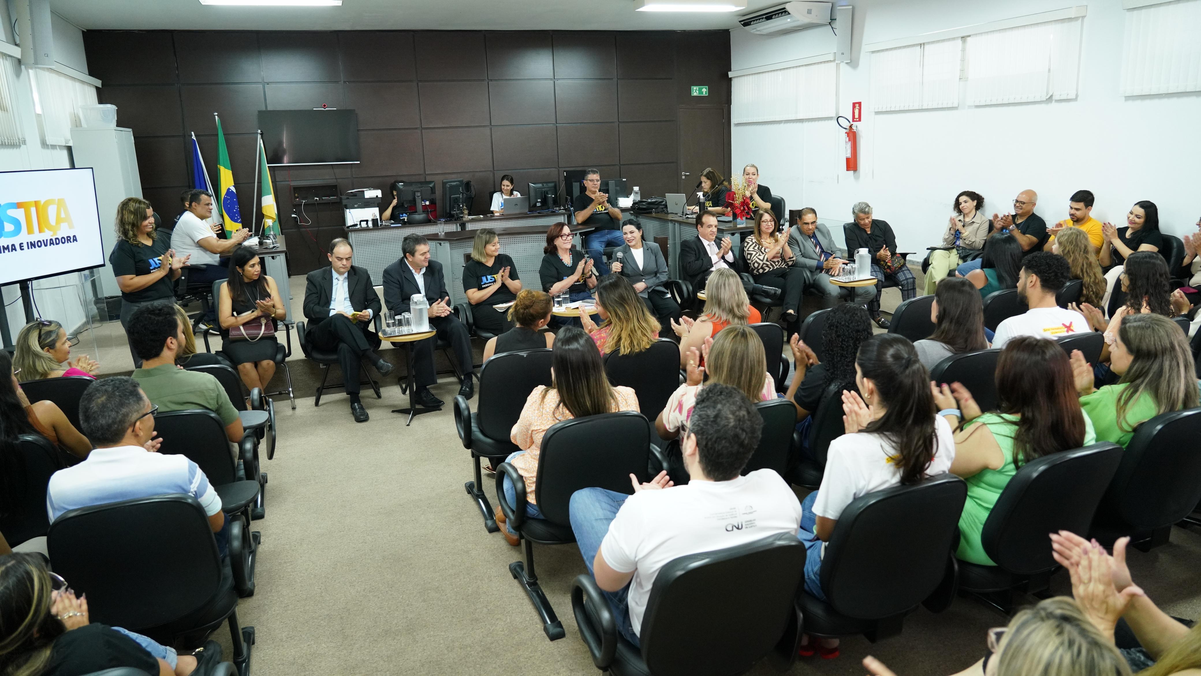 Sabe aquela família grande, em que o sofá está sempre apertadinho, a mesa de jantar está rodeada de pessoas, repleta de alegria e aquele calor humano? Pois assim ficou o salão do Tribunal do Júri nesta quarta-feira. Servidores(as) novos(as), com décadas de dedicação ao Judiciário, e aqueles à espera da aposentadoria escutaram atentamente toda a equipe do TJTO. Eles fizeram perguntas à presidente, riram, participaram de momentos lúdicos, assistiram produções do Centro de Comunicação e conheceram as inovações da gestão 2023/2025.