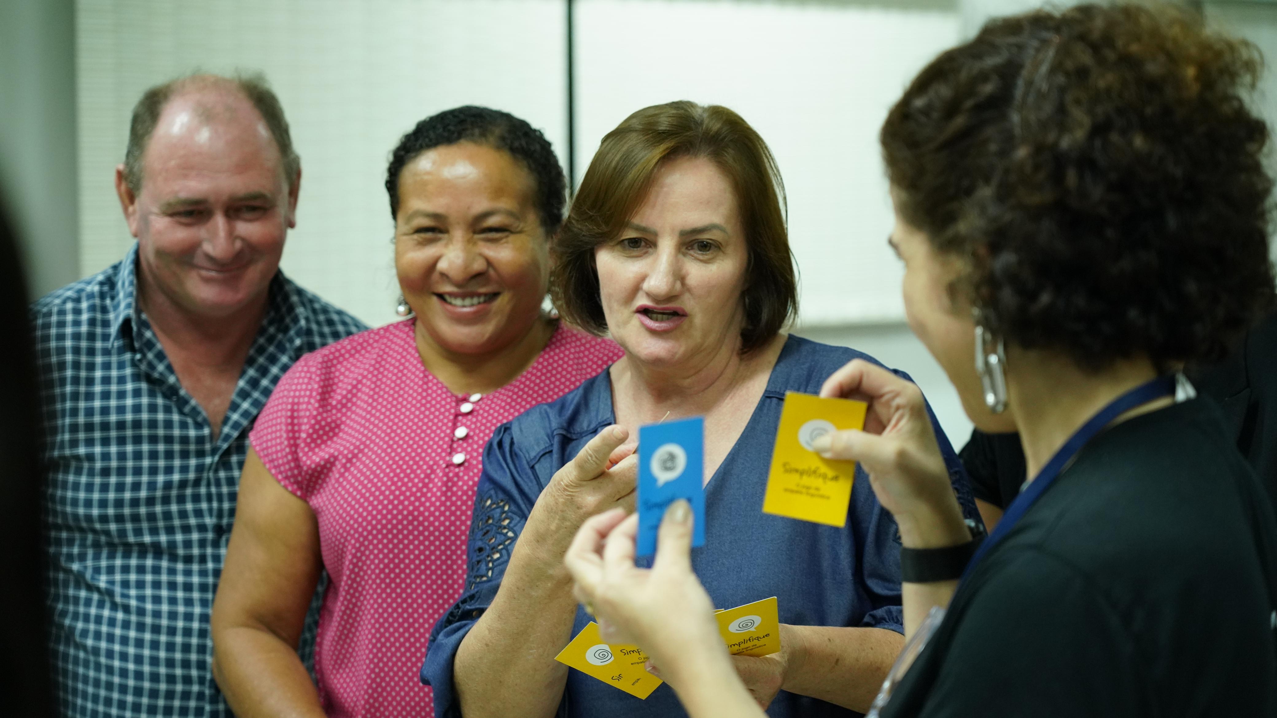 Rondinelli Ribeiro A imagem tem um grande grupo de pessoas sorrindo que está reunido em uma sala, cada uma segurando um pequeno objeto colorido acima da cabeça. Muitas pessoas estão usando camisetas com a palavra "Justiça" impressa nelas.