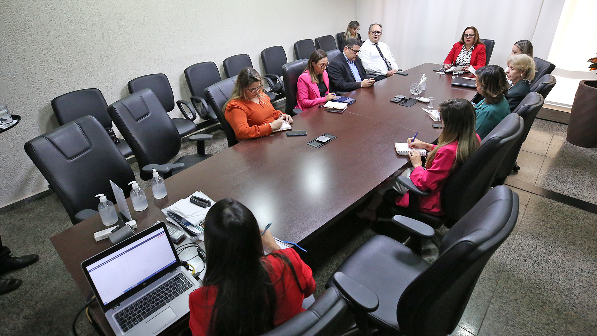 Elias Oliveira Desembargadora Ângela Prudente de roupa vermelha e banca sentada ao fundo da mesa ao lado de mebros do Grupo de Trabalho do TJTO