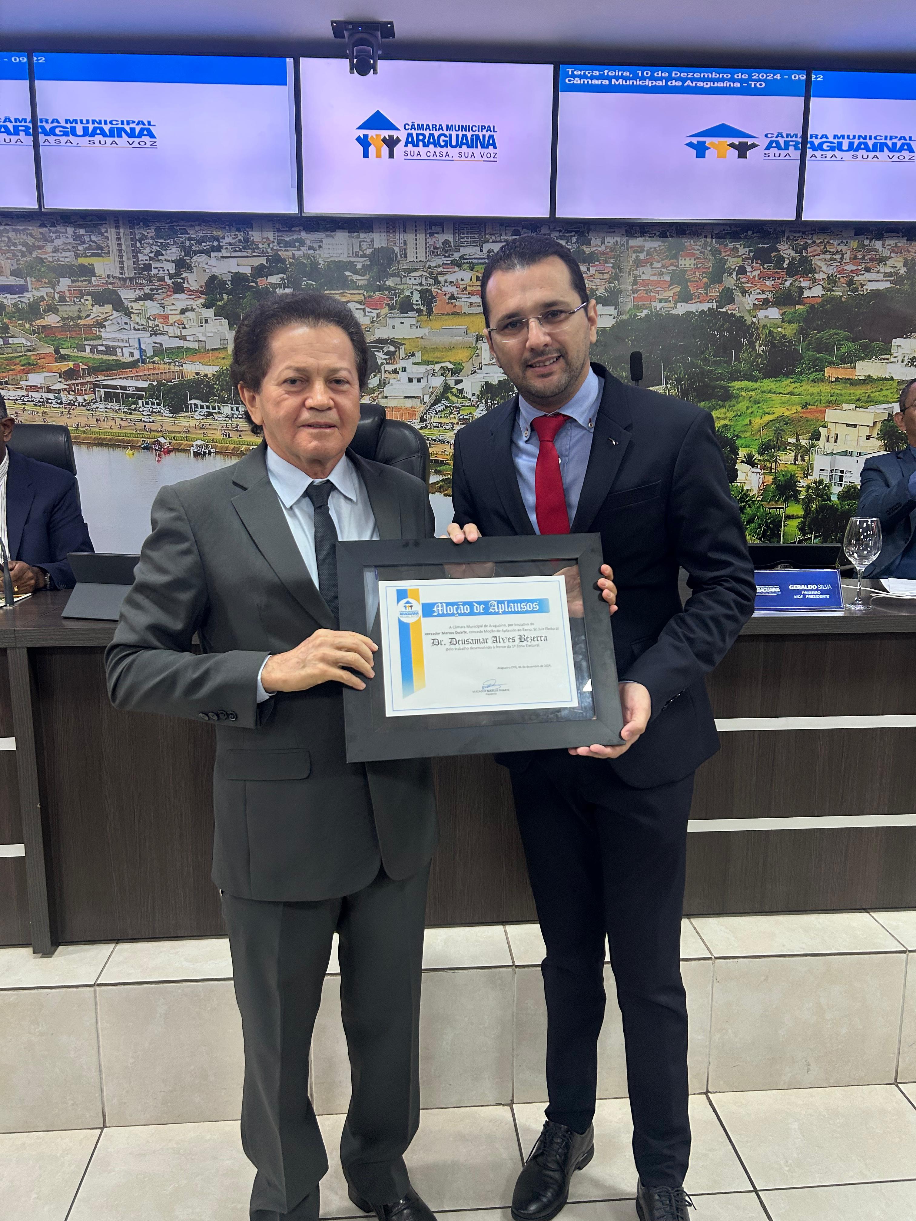 Pelo trabalho desempenhado na 1ª Zona Eleitoral em Araguaína, Norte do Estado, o juiz Deusamar Alves Bezerra, que também é coordenador do Centro Judiciário de Solução de Conflitos (Cejusc) da comarca, recebeu Moção de Aplausos outorgada pela Câmara Municipal de Araguaína. A homenagem ocorreu durante sessão realizada nesta terça-feira (10/12).