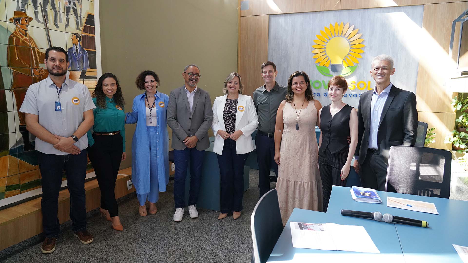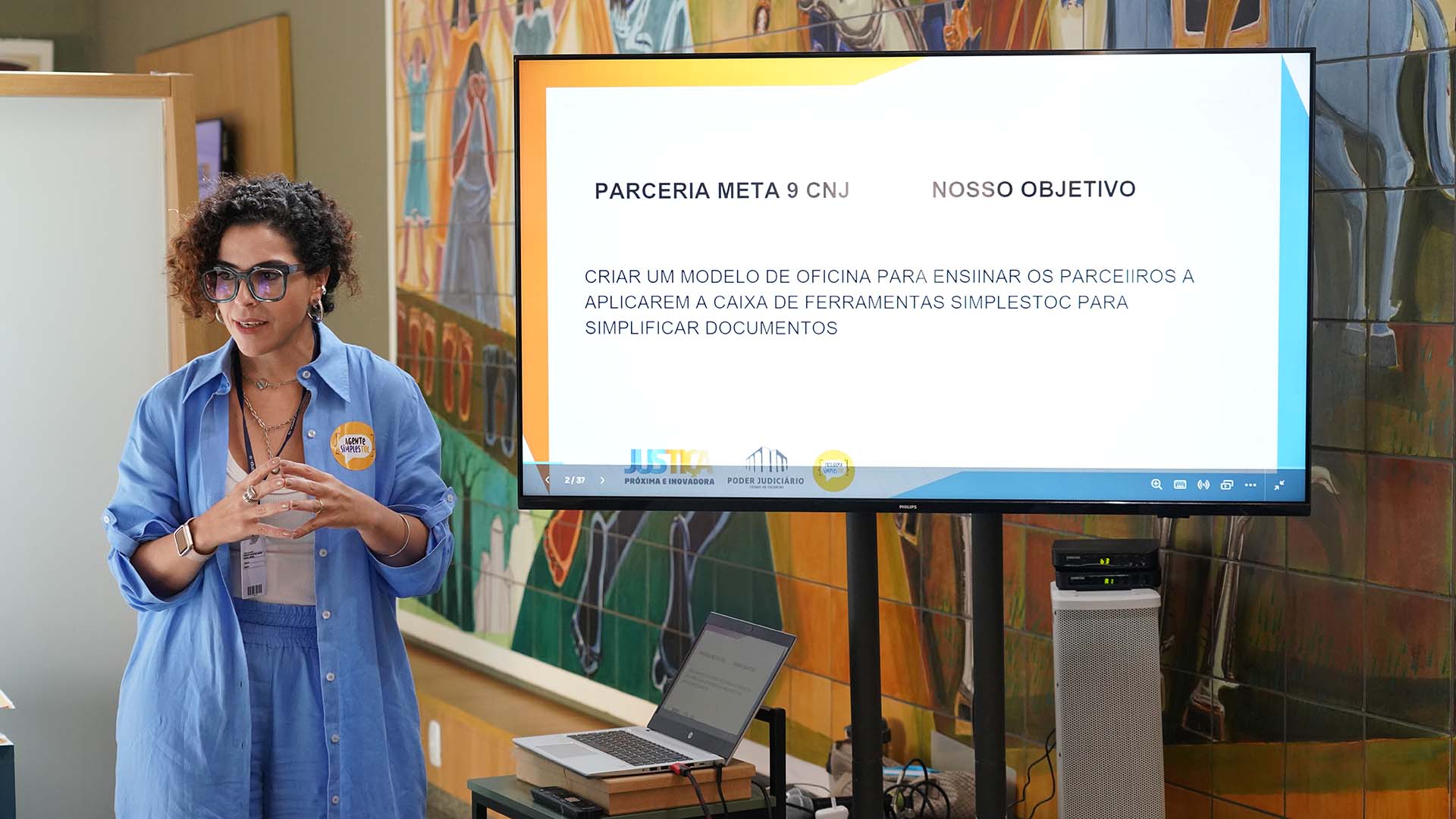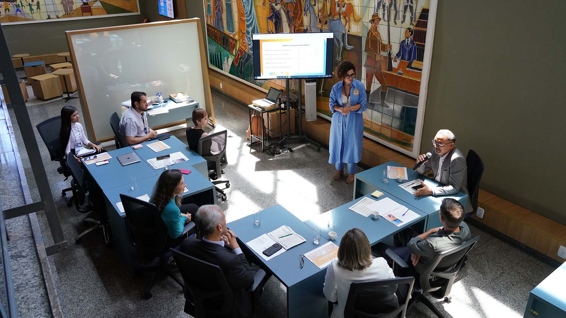 Rondinelli Ribeiro Mulher parda de cabelos curtos e cacheados, de vestido longo, azul claro, em pé dando oficina para pessoas sentadas de costas em torno de mesa em L. Atrás dela, uma pintura em um grande painel, e uma tv ao seu lado