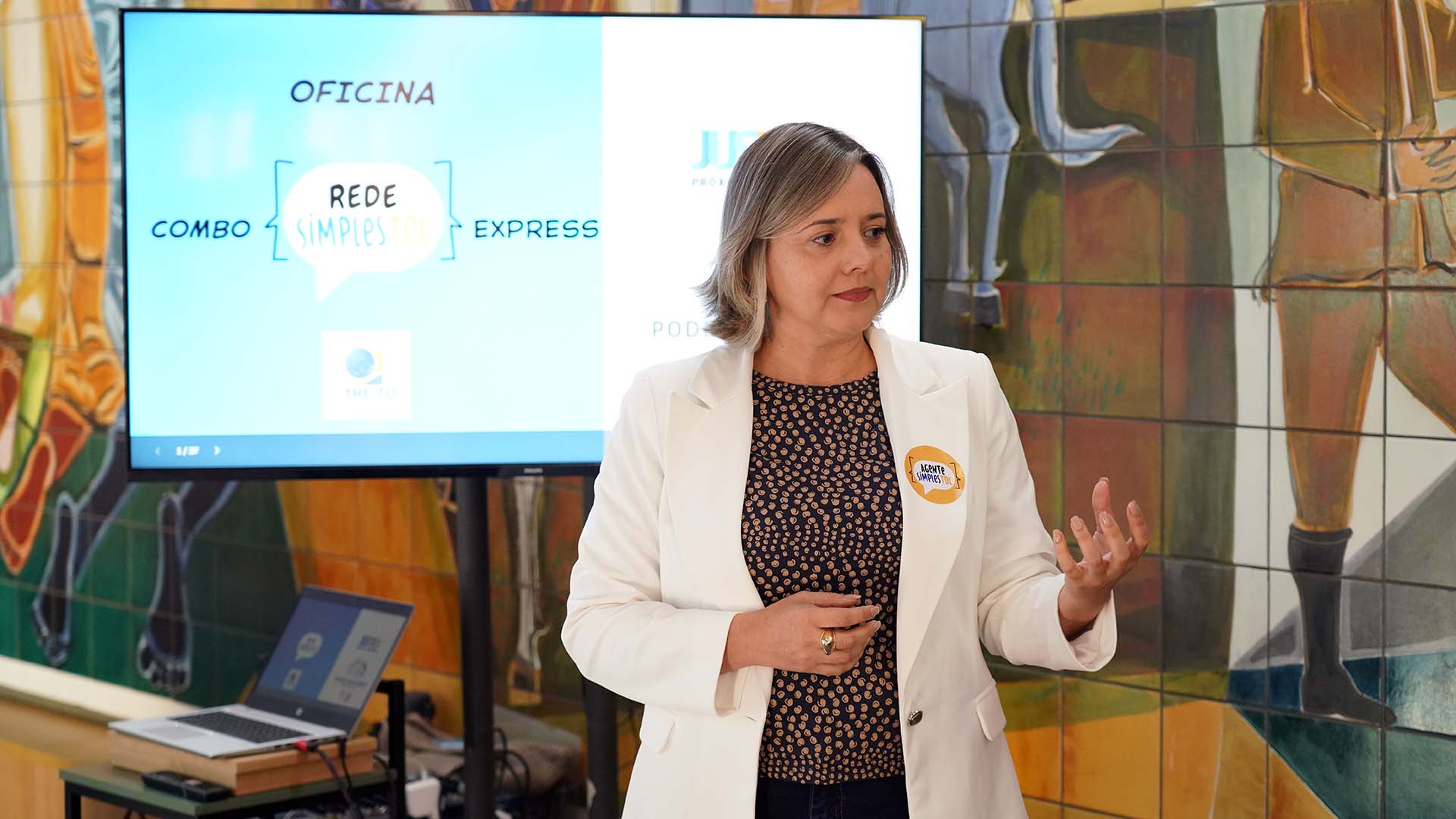A facilitadora e cogestora do programa SimpleTOC, Roberta Maciel, conduziu a oficina do projeto, abordando sobre os ajustes necessários para a implementação da linguagem simples e apresentando o programa. “Queremos que outros parceiros que se interessarem possam também realizar suas oficinas usando essa caixa de ferramentas, desenvolvida em cocriação durante uma formação com nossos agentes de linguagem", explicou Roberta.