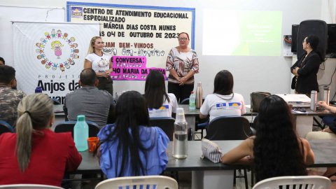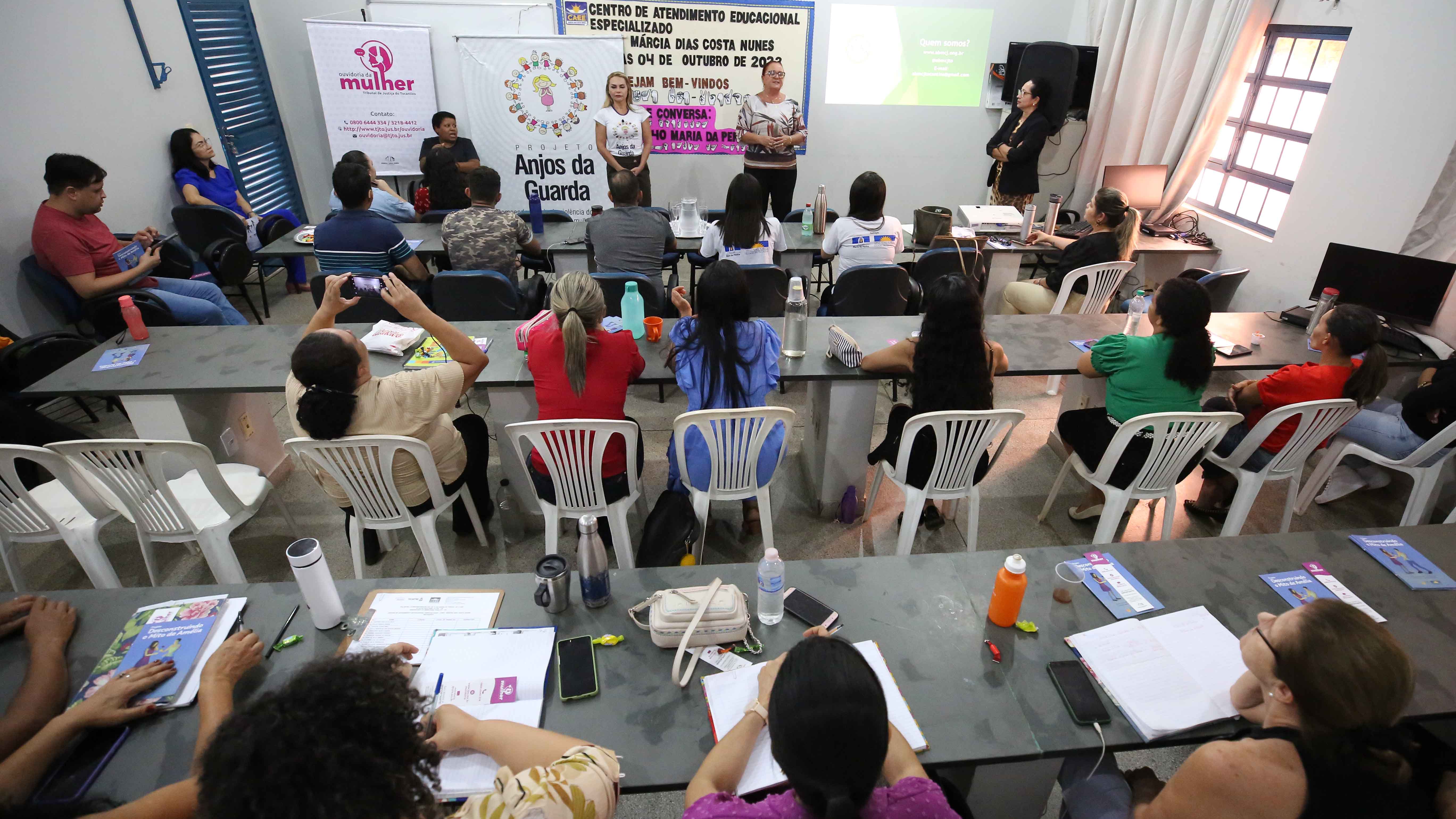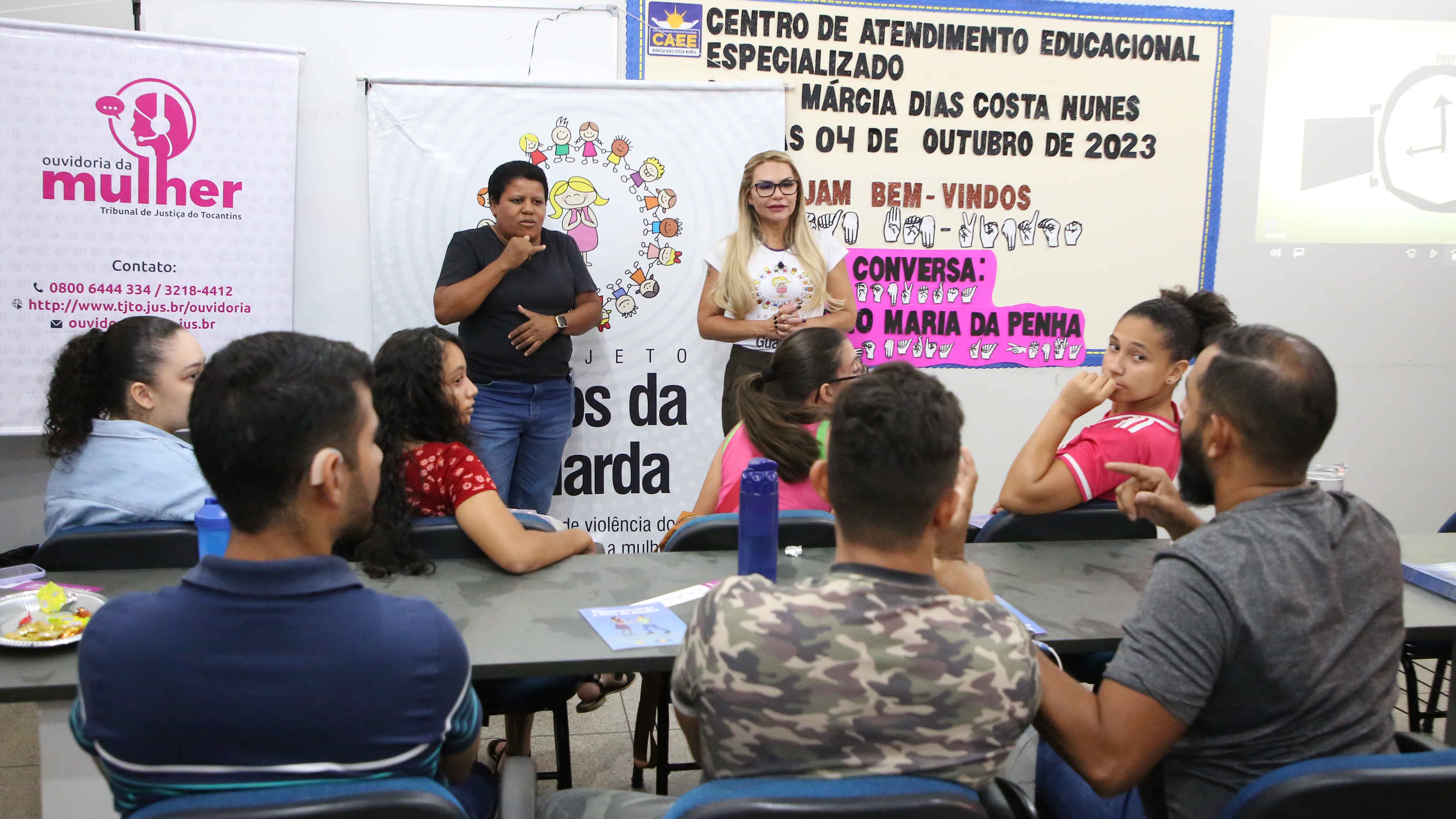 Com o tema “Lei 11.340 Maria da Penha”, foi realizada, na tarde desta quarta-feira (4/10), mais uma roda de conversa prevista na programação do projeto Maria nas Comunidades. A ação ocorreu no Centro de Atendimento Educacional Especializado (CAEE) Márcia Dias Costa Nunes, localizado na região sul de Palmas, e contou com tradução em Libras e a participação de alunos com deficiência auditiva e educadores.