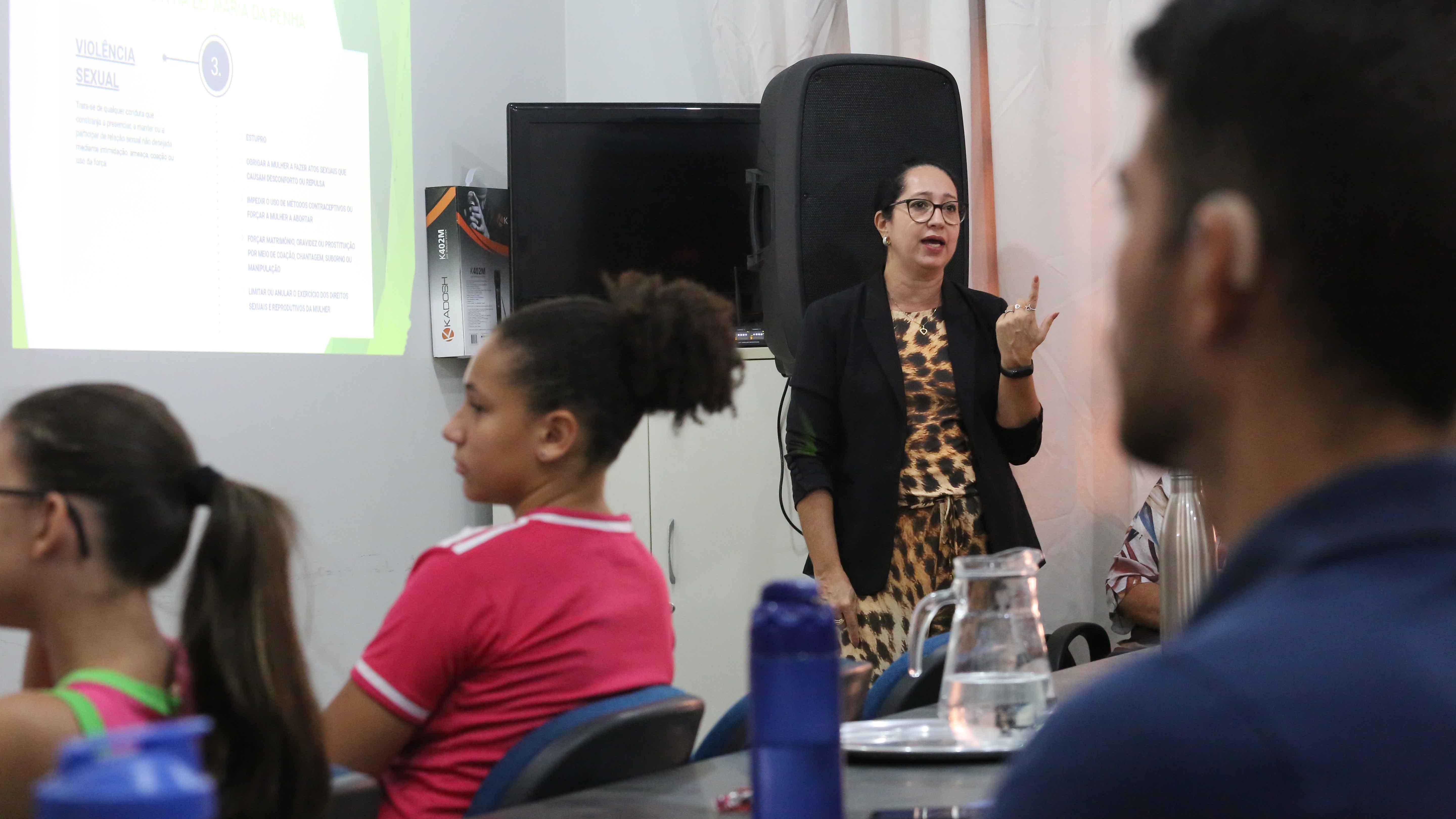 Durante a palestra, Gizella Bezerra falou sobre a importância da Lei Maria da Penha, publicada em 2006. Em contrapartida, alertou para o fato de o Brasil ainda ser um dos países que mais mata mulheres no mundo. Além disso, também destrinchou os tipos de violências que se enquadram na Lei Maria da Penha: violência patrimonial, psicológica, física, sexual e moral.